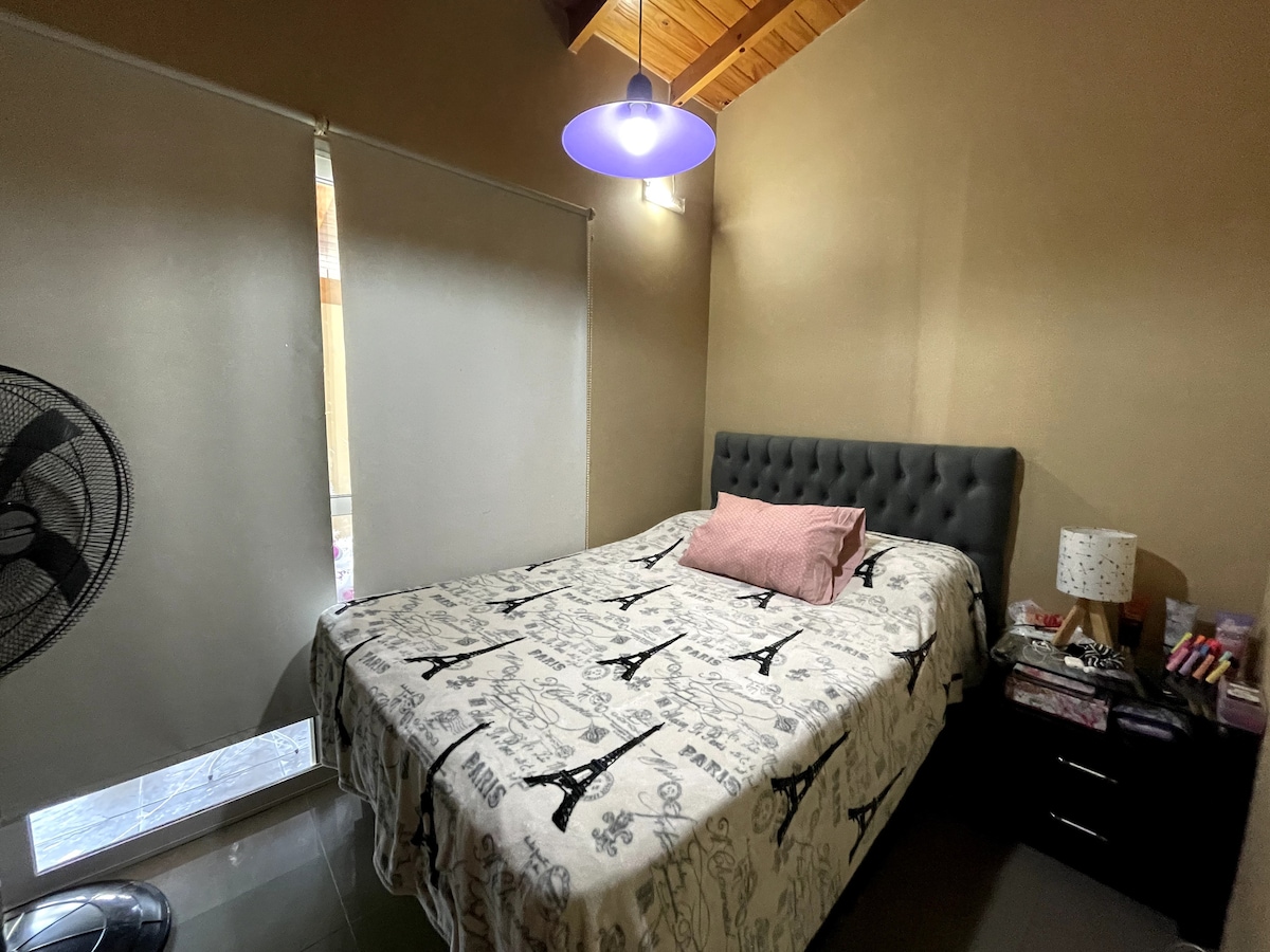 NO HAY Garage/cocheras. Precio Solo para 2 personas. NO incluye desayuno de la foto. Casa amigable con el medioambiente, con 5 entradas de luz natural. Dormitorio, con cama grande y escri, Aire. (saba c/3 días). Living con otra cama queen, estufas,TV. Netflix , You TUBE. Mesa y sillas. Cocina amplia. Baño con Jacuzzi por una diferencia, y accesorios. Toall (c/2 días). Patio privado. A disposición agua Te, Café, gratis. No incluye desayuno de la foto.