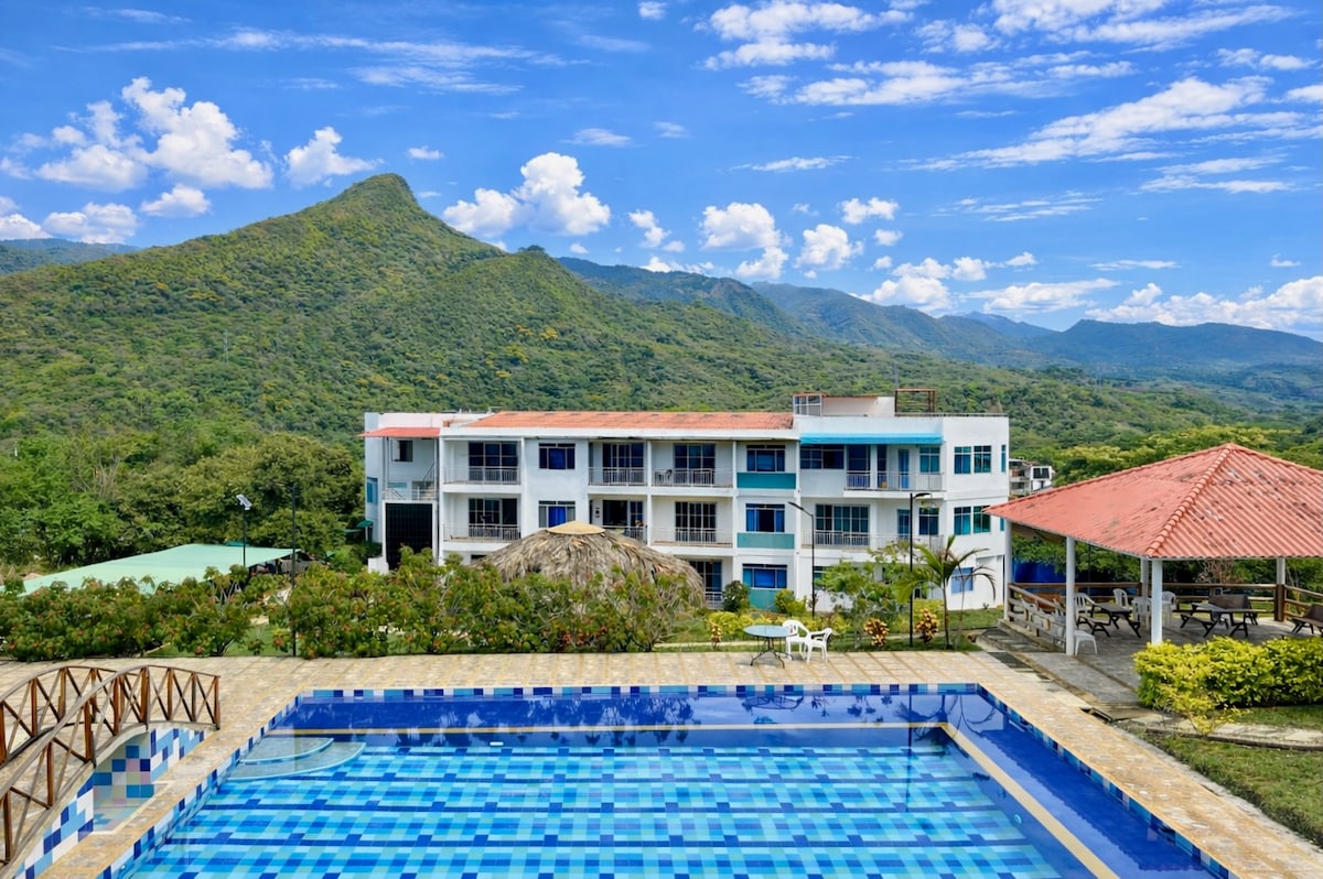 Disfrute de una hermosa vista de la cordillera central y los valles colombianos. ¡Ahora con Wifi banda ancha! (hasta 4 dispositivos, 60 Mbps) La propiedad está rodeada de hermosos jardines y la iluminación de la casa es perfecta (luz del sol durante el día y lámparas bien distribuidas por la noche). La villa cuenta con cocina integral, sala, comedor, piscina completamente privada, equipo de sonido y camas con sábanas. NO contamos con servicio de TV. Registro Nacional de Turismo No. 94066