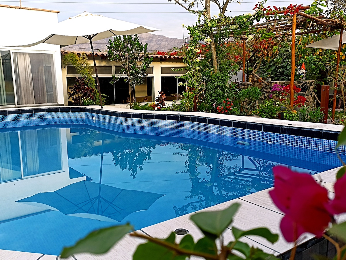 ❤️ Hermosa casa de campo, a con una bella vista a las montañas y al valle de Cieneguilla. Refréscate en la gran piscina de 8.5 metros, descansa en las perezosas, en las tumbonas o por qué no en el césped fresco bajo un árbol de ese amplio jardín, donde encontrarás sol todo el año. El jardín cuenta con áreas sociales y de relajo. Cuenta con una moderna cocina de chef. En la sala se puede ver una doble altura con ventanas gigantes. En la noche podrás prender la chimenea acompañado de un buen vino.