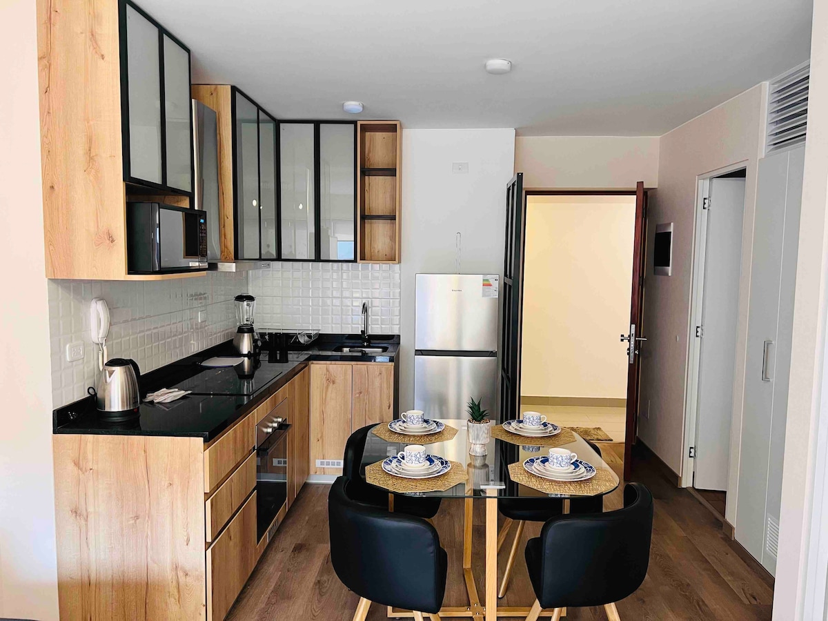 Disfruta de una experiencia con estilo en este departamento de estreno, céntrico, moderno, muy elegante y acogedor, ubicado en el corazón de Miraflores y cerca a los mejores restaurantes, bares, cines, teatros, tiendas, supermercados y principales puntos turísticos de la ciudad. Exquisitamente decorado y con todas las comodidades para disfrutar de una estadía inigualable. Ideal para una escapada romántica en pareja y para trabajar en remoto con todas las comodidades de una oficina de lujo.