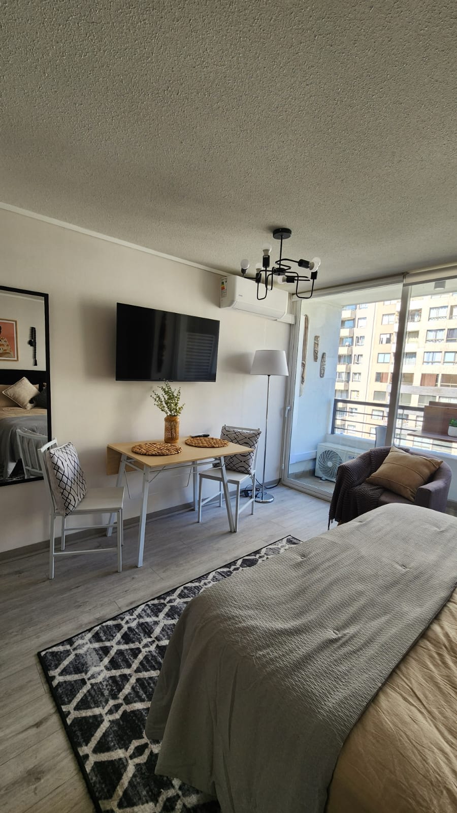 Modern, well-kept studio in Santiago, in a quiet area of La Florida, just 2 min 🚇 from Bellavista La Florida Metro and Mall Vespucio. Everything within walking distance: supermarkets, clinics, pharmacies, restaurants, and essential services. Ideal for couples, tourists, or work trips. Includes AC ❄️, high-speed WiFi 📶, equipped kitchen, 55” smart TV, modern bathroom with bidet + drying 🚿, work/dining table 💻, terrace with city + mountain views 🌃, and easy self check-in.