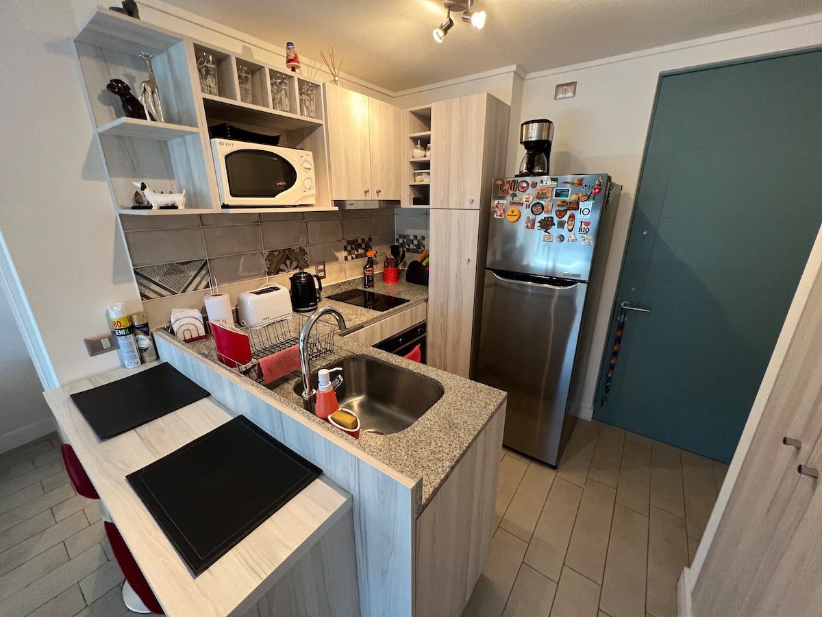 Welcome! Enjoy your stay in a brand-new apartment, designed for you to relax after a day exploring the city. Located in the heart of Santiago, you'll be steps from the subway, buses, shops, restaurants, museums, and the best views of the city. Paseo Bulnes, Almagro Park, La Moneda, Cerro Santa Lucía, Lastarria/Barrio Italia. It has everything you need: a comfortable bed, a fully-equipped kitchen, Wi-Fi, and plenty of amenities. Everything you need to explore Santiago!