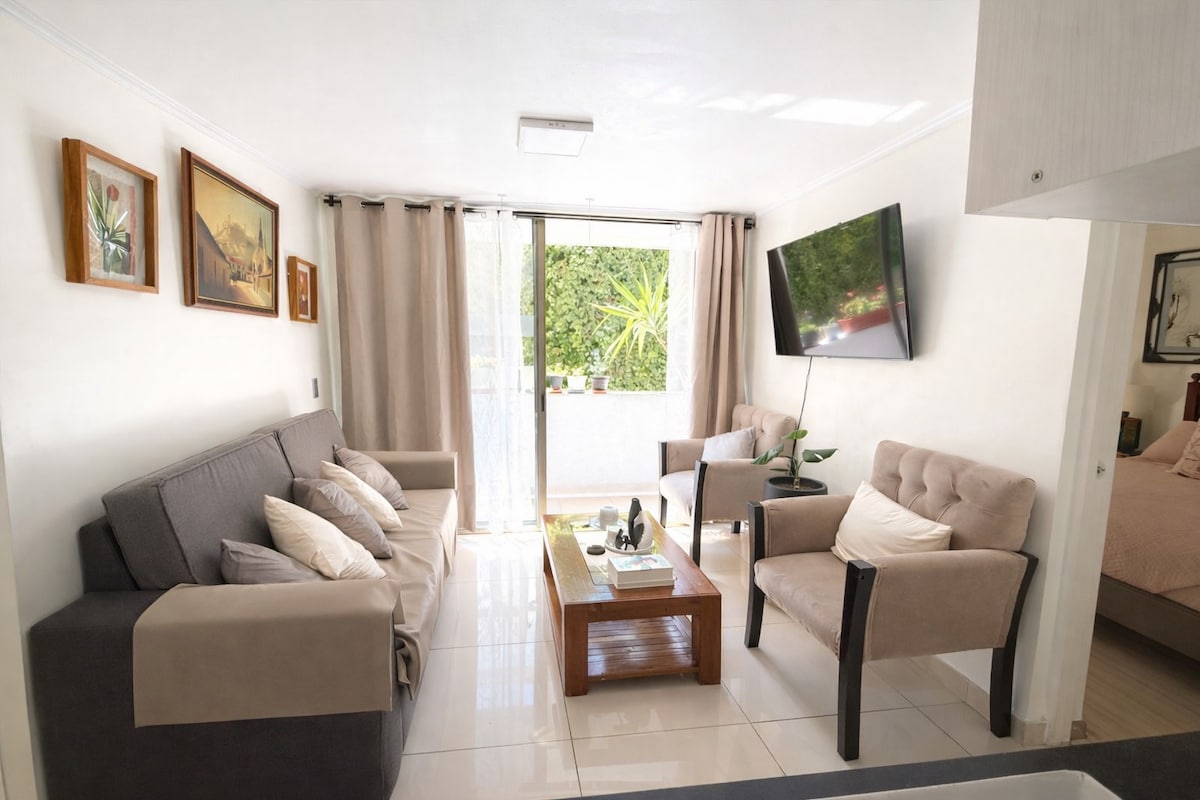 Welcome! Enjoy your stay in a brand-new apartment, designed for you to relax after a day exploring the city. Located in the heart of Santiago, you'll be steps from the subway, buses, shops, restaurants, museums, and the best views of the city. Paseo Bulnes, Almagro Park, La Moneda, Cerro Santa Lucía, Lastarria/Barrio Italia. It has everything you need: a comfortable bed, a fully-equipped kitchen, Wi-Fi, and plenty of amenities. Everything you need to explore Santiago!