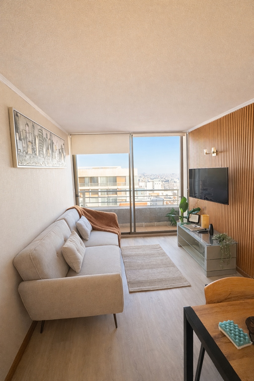 Encantador departamento en el corazón de Santiago con una impresionante vista panorámica del centro de la ciudad. Disfruta de los rascacielos iluminados por la noche y de paisajes urbanos durante el día. Este acogedor espacio cuenta con comodidades modernas, una decoración elegante y todas las comodidades necesarias para una estancia inolvidable. Desde el balcón privado, podrás deleitarte con vistas panorámicas que abarcan desde la cordillera hasta los puntos emblemáticos de la ciudad.
