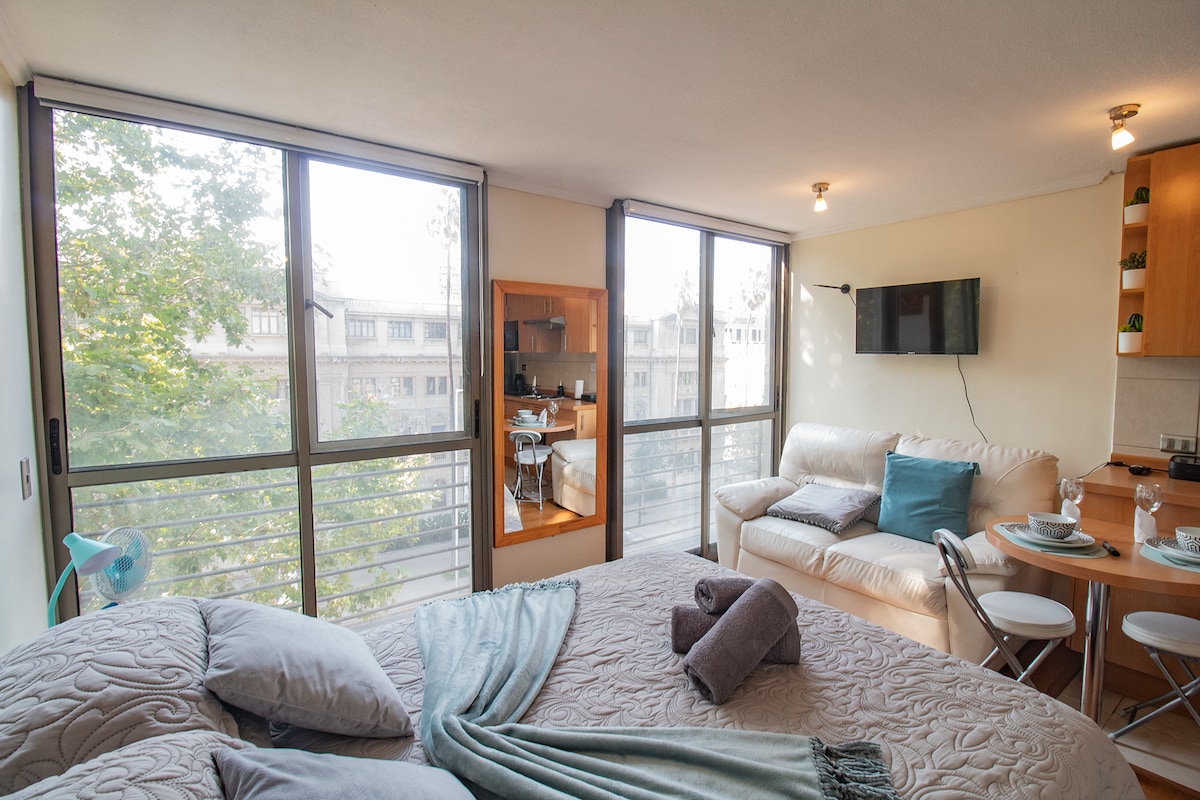 Conserje las 24 horas. Departamento nuevo y acogedor en barrio turístico del centro de Santiago de Chile. Cuenta con todas las comodidades para una estadía placentera. A pasos de la principal avenida de la ciudad y metro línea 1. Cercano a sector turístico cerro santa Lucía y barrio Lastarria. Además de clínica UC Christus, hospital posta central y universidades. Cuenta con estacionamiento propio, aire acondicionado en dormitorio principal y malla protectora para niños.