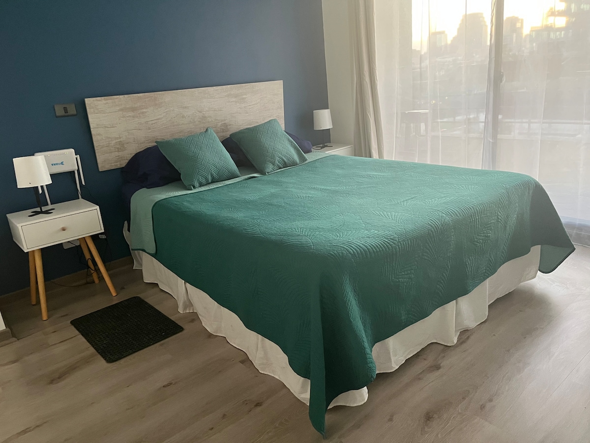 Moderno y acogedor departamento con aire acondicionado en el corazón de Santiago. A pasos del metro y del Centro Histórico, rodeado de museos, mercados y restaurantes. Cama king, cocina equipada, balcón y wifi rápido, ideal para viajes o estadías largas. Edificio seguro con conserje 24/7. Atención personalizada, check-in flexible y recomendaciones locales para que disfrutes la ciudad como un residente, con comodidad y tranquilidad.