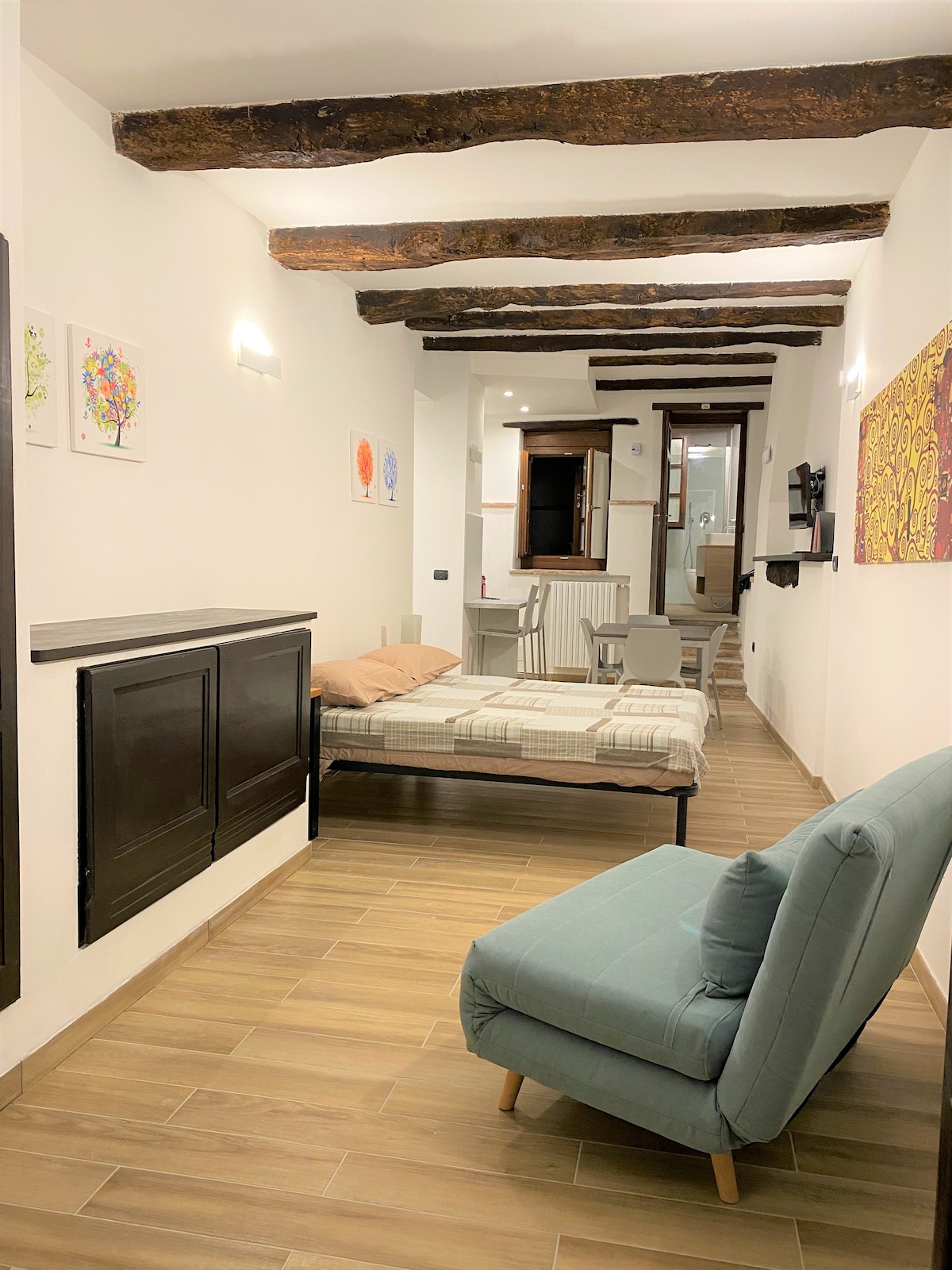 In the heart of La Morra in a recently restored building of the '700, with a characteristic wooden beam ceiling, the accommodation is a studio apartment combined in a modern style with sober furnishings. Consisting of kitchen; a large living area with table and TV area, leaves room for the sleeping area with its queen bed. A sofa bed for one person completes the apartment along with the full bathroom with shower and a built-in wardrobe.