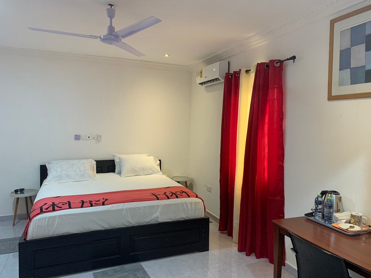 Forget your worries in this spacious and serene space. It is a 15 minutes drive from the airport and close to the Legon botanical gardens, Palace Mall, KFC, Papaye restaurant and Papa's Pizza all in North Legon. It has an aircondition, free wifi, fridge, a dining area, and a microwave. The bedroom has comfortable chairs and a table to work from and use as a dining area. Other things to Note The kitchen is the only shared space in the apartment which is shared with the host.