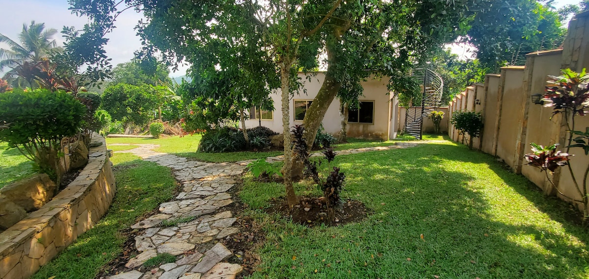 Looking to experience stylish comfort at a peaceful location? This spacious three -bedroom apartment is nestled in a villa close to the Aburi mountains. Enjoy the privacy of having the entire apartment to yourself, with family or friends. The apartment also features a balcony view and a clean cozy bathtub if you love alone time and for the lovers of adventure, the Aburi mountain hike is your best bet!