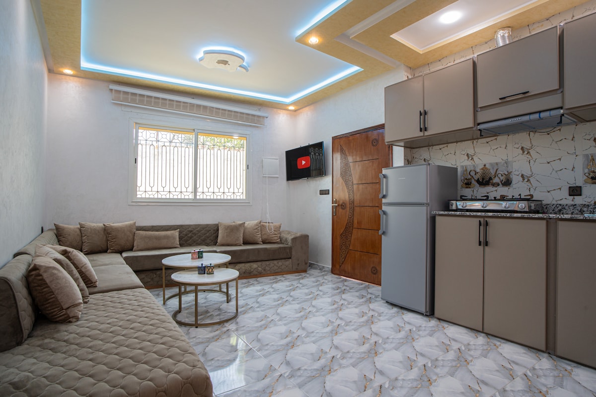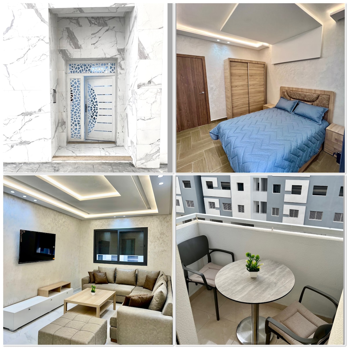 Amusez-vous avec toute la famille dans ce logement chic. Appartement dans une résidence sécurisée et fermée, proche de l aéroport et les plages de Tanger... Un spacieux Salon avec fauteuils de qualité, une smart TV de 50 pouces. une Chambre parentale avec dressing, 2eme chambre avec deux lits séparés et l ensemble avec matelas médicaux Simons. une cuisine bien équipée, tout électrique avec 0 équipement en Gaz pour votre sécurité. une spacieuse douche avec un chauffe eau électrique Junkers.