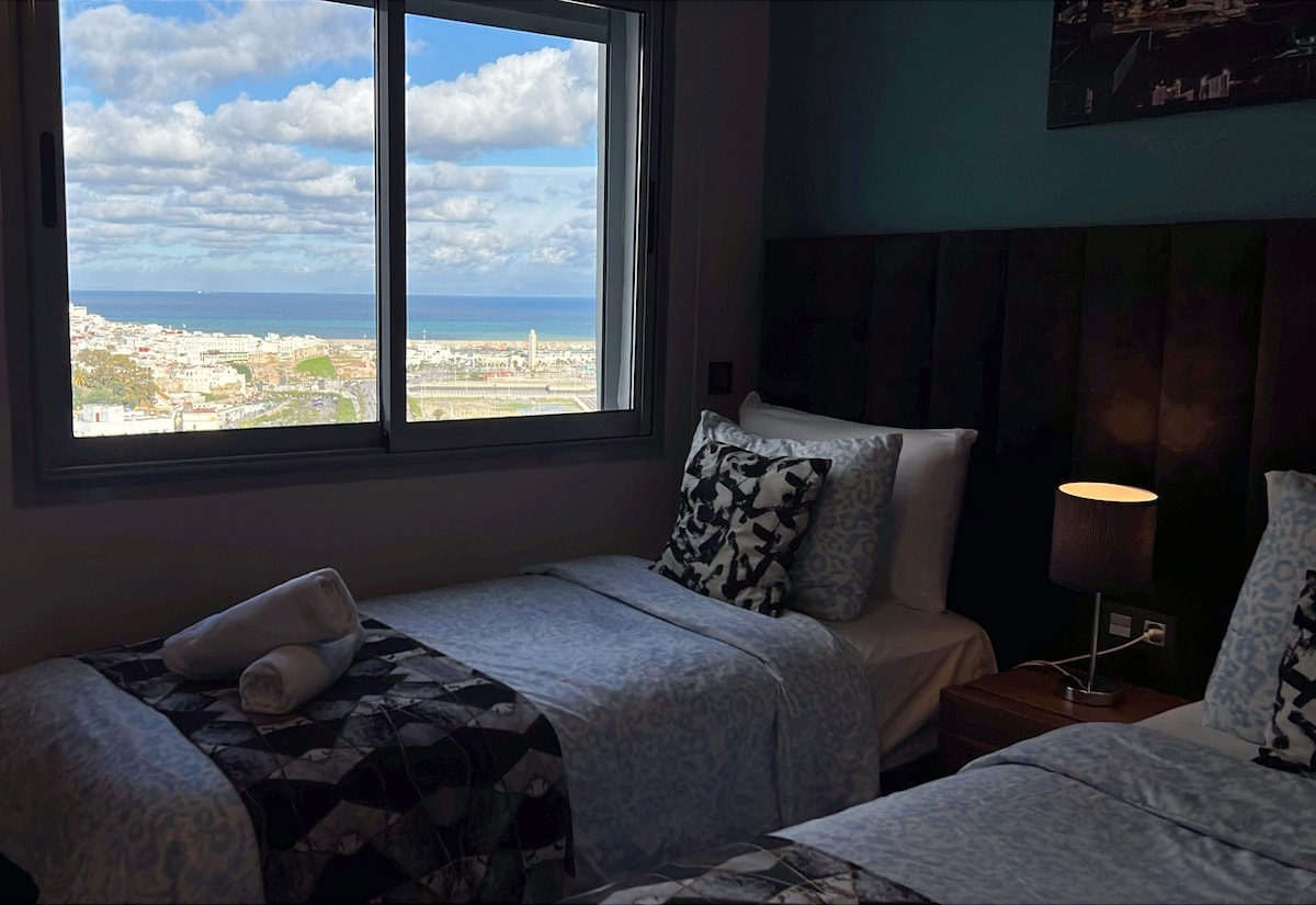 Fantastique appart avec un excellent emplacement (Corniche & Boulevards principaux), à 5 min à pied de la plage, macdo, restaurants, 4 min du mall Tanger city center (cinéma, restaurants, supermarché, shopping), 4 min à pied de la gare du train(TGV). Bien équipé (télé, clim, wifi, literie, serviettes, et), dispose d'1 lit double, d'1 canapé, d'1 bureau, d'1 cuisine bien équipée, d'1 salle de bain. (Important:Couple Musulman ou marocain non mariés s'abstenir et merci)