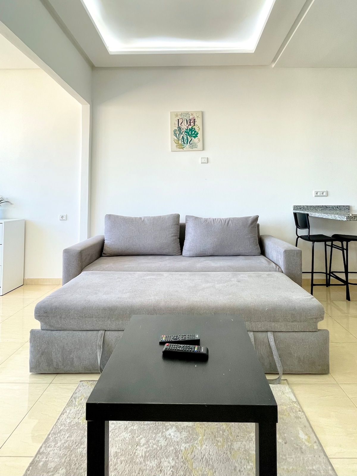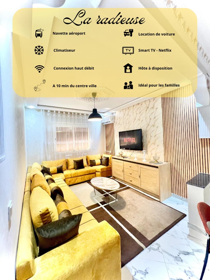 Amusez-vous avec toute la famille dans ce logement chic. Appartement dans une résidence sécurisée et fermée, proche de l aéroport et les plages de Tanger... Un spacieux Salon avec fauteuils de qualité, une smart TV de 50 pouces. une Chambre parentale avec dressing, 2eme chambre avec deux lits séparés et l ensemble avec matelas médicaux Simons. une cuisine bien équipée, tout électrique avec 0 équipement en Gaz pour votre sécurité. une spacieuse douche avec un chauffe eau électrique Junkers.