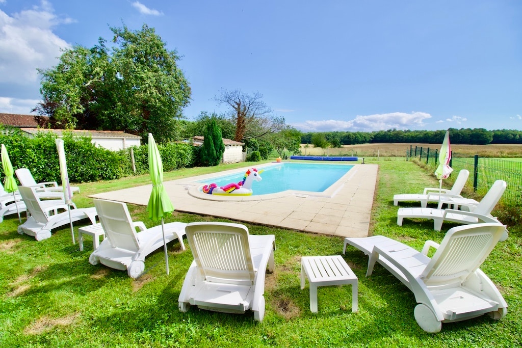 Les Chapelles is a small country hamlet in the Charente-Maritime between the historic Roman town of Saintes & the beautiful beaches of Royan. Le Cadran Solaire is a 3 double/twin bedroom 200 year old cottage, luxuriously appointed with all mod cons, private outdoor space for relaxing, eating & drinking and access to the shared 3 acre garden, shady children's playroom, table tennis and heated indoor pool with sun deck. Larger groups can book with our 2 bedroom apartment, La Cachette