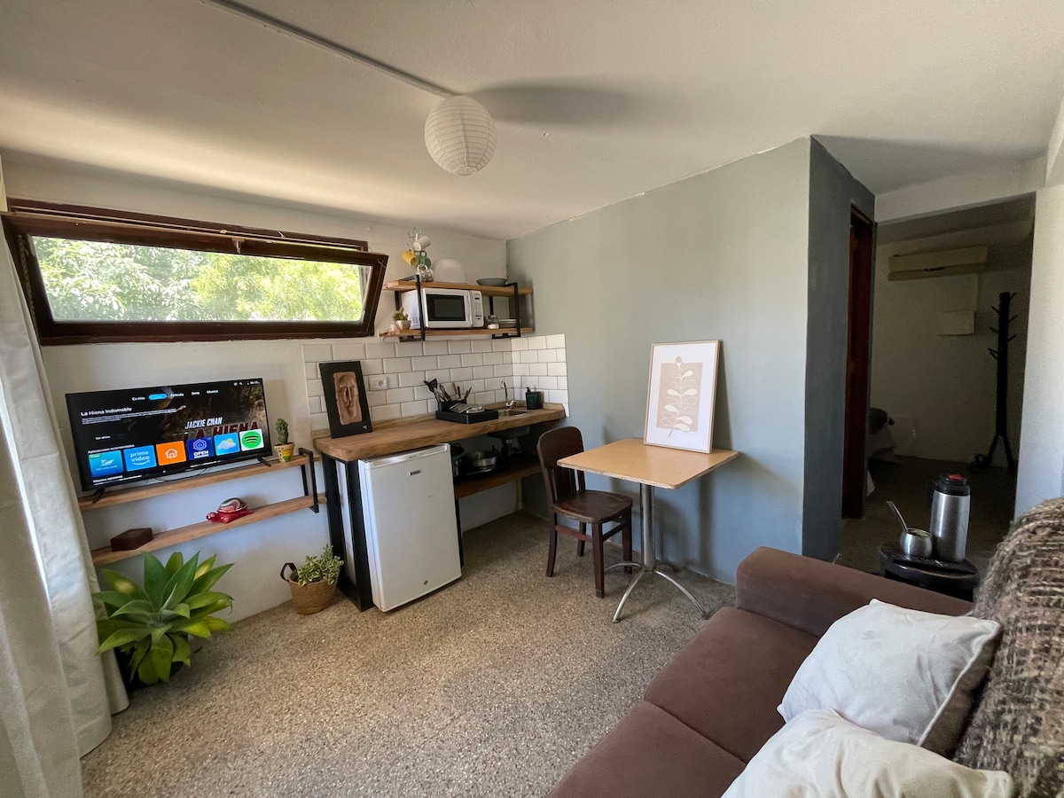 Casa independiente con entrada propia y cochera para un vehículo. La casa cuenta con cama matrimonial y una cama marinera, cocina-comedor y baño completo, exterior con parrillero propio y espacio exclusivo con mesa y sillas. Aberturas con mosquiteros y rejas, paredes de ladrillo, cerámicos en pisos y paredes de baño y cocina. El predio se encuentra totalmente cercado y tiene un monte nativo de 800 metros cuadrados.