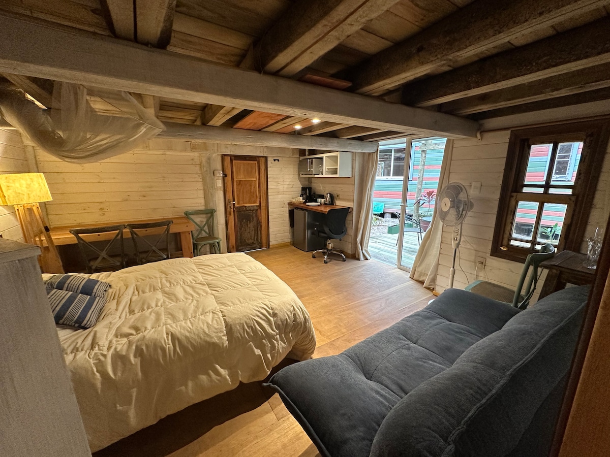 Cabaña ESTE es un refugio luminoso entre el bosque y el mar de La Serena. Orientada al Este, recibe el sol del amancer en un ambiente cálido, sereno y natural. Rodeada de pinos y a pocos minutos de la playa, es ideal para parejas o personas que viajan solas y buscan descanso, inspiración y silencio. Cuenta con terraza para desayunos tranquilos, luz natural durante todo el día, noches de cielo estrellado sin contaminación lumínica y un entorno íntimo para desconectar y disfrutar a otro ritmo.