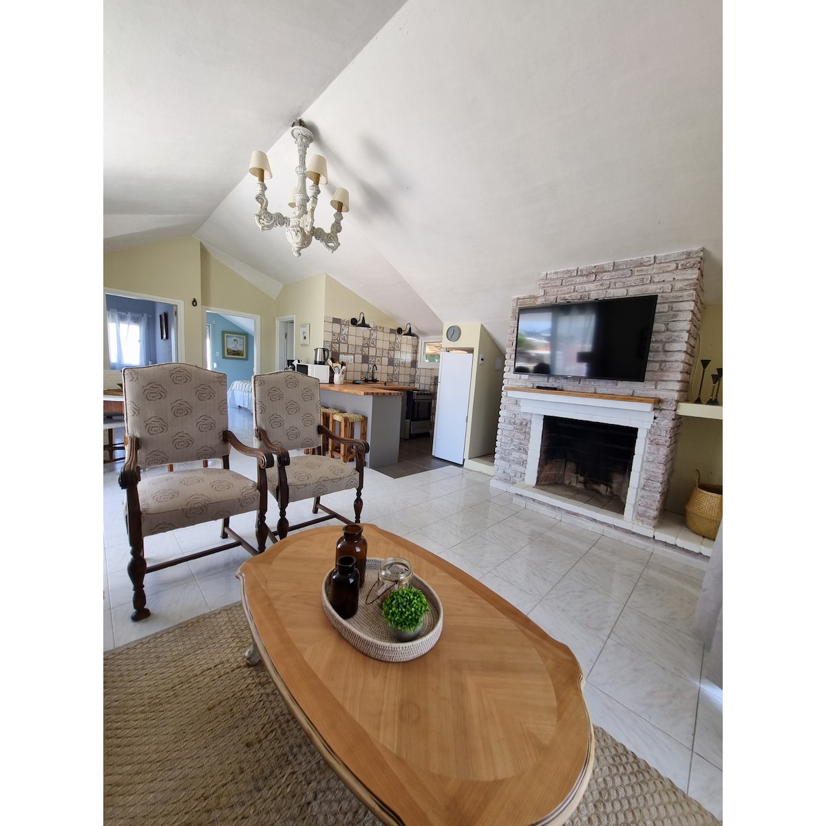Countryside house with a distant view of the ocean and shared swimming pool. An immersion in nature from the comfort of a modern and cozy loft, perfect for couples or up to three people. Wood stove, spacious living room, and large dining table. Full kitchen and covered outdoor barbecue. Mezzanine with double bed and a baywindow... Come and enjoy trekking, visiting the nearby protected area, going to the beach or simply observing nature at its best (no wi-fi, by the way).