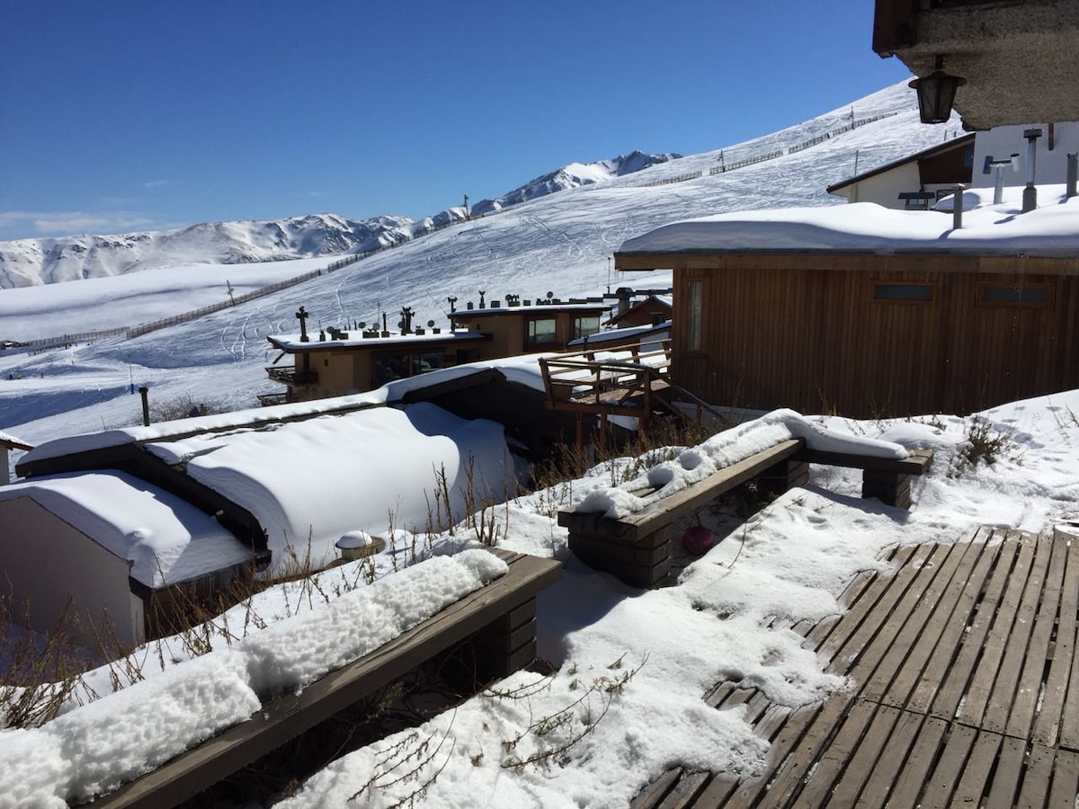 Departamento de 70M2 a 50m del jardín de nieve y escuela de ski, telesilla Alpha, restaurantes. Equipado para cinco personas con sabanas. Dormitorio suite con baño, segundo dormitorio abierto con camarote y baño, calefacción comet a parafina.