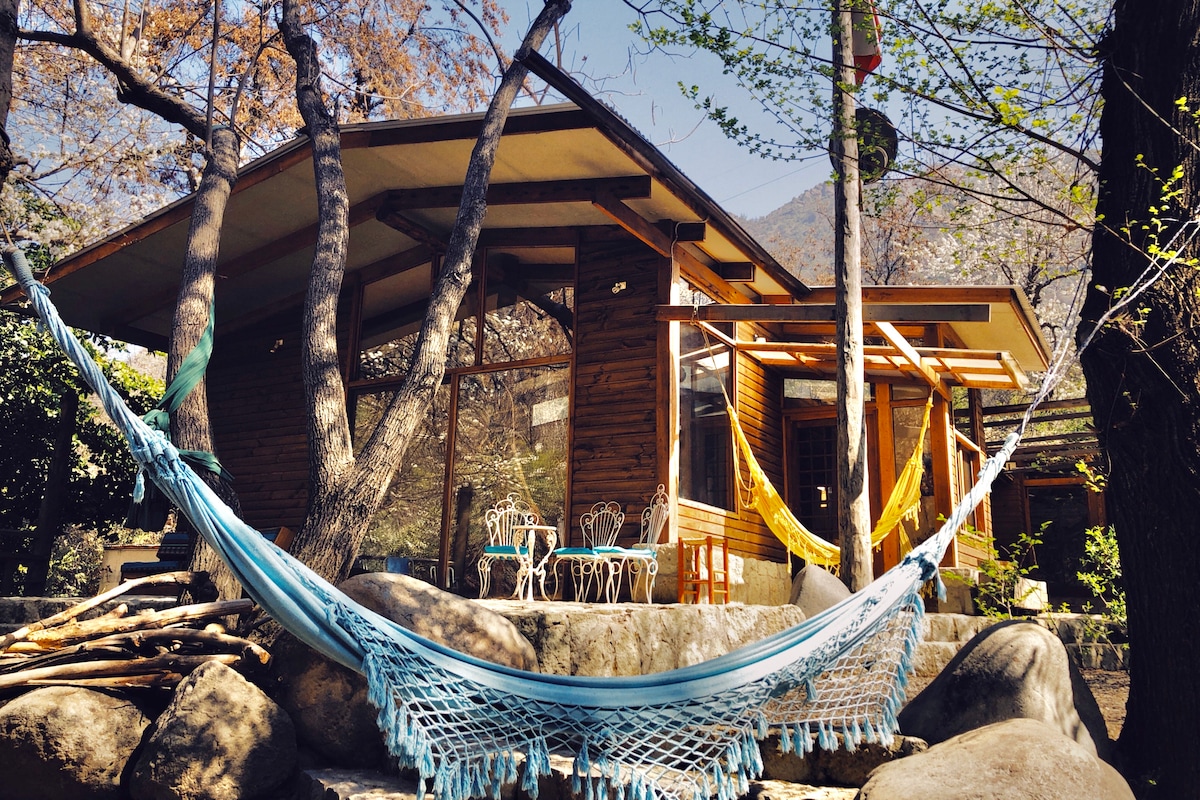 See El Arca Naranja, Ecologic Cabin too! Cabaña for 2 people, 20 min from Santiago, surrunded by montains, trees and wild life. Kitchen all equipped, gaz stove for cooking, little oven, fridge, inside bathroom, hot shower and fireplace. Trekking routes, street and mountain bike, little river to swim, gardens with aromatic plants and spices, hammock, barbecue grill, near ski centers and mountains landscape, local handcraft. Available week and week end Discount for longer stay