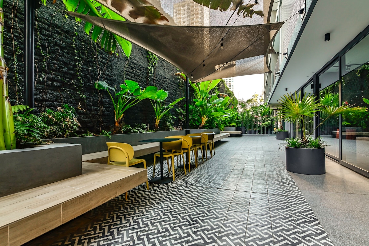 Moderno departamento en piso alto, con terraza cerrada, vista panorámica a la cordillera, piscina climatizada, gimnasio y estacionamiento incluido, a pasos del Mall Parque Arauco y Clínica Alemana. Ideal para viajes de trabajo o escapadas románticas.