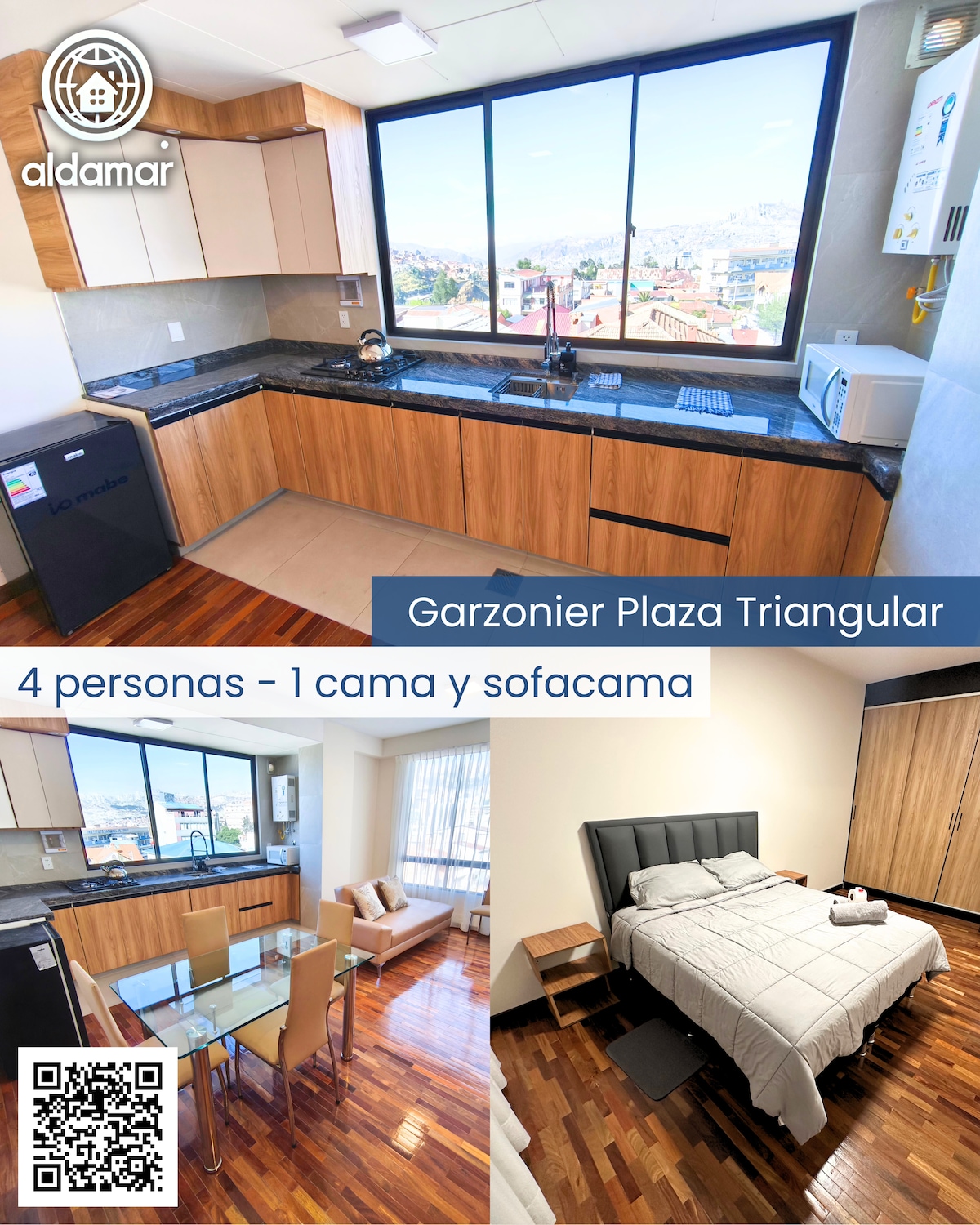 Ubicado en una zona comercial, con supermercado en el mismo edificio, parada de radio taxi y teleférico a una cuadra. Se trata de un departamento cómodo y acogedor con decorado estilo europeo que incluye 2 dormitorios y un escritorio además de otras dependencias con conexión a wifi. El departamento cuenta también con estacionamiento propio. El lugar se encuentra en el corazón de Miraflores, a 10 minutos de la Plaza Murillo y Sopocachi y a 15 minutos de la Zona Sur.