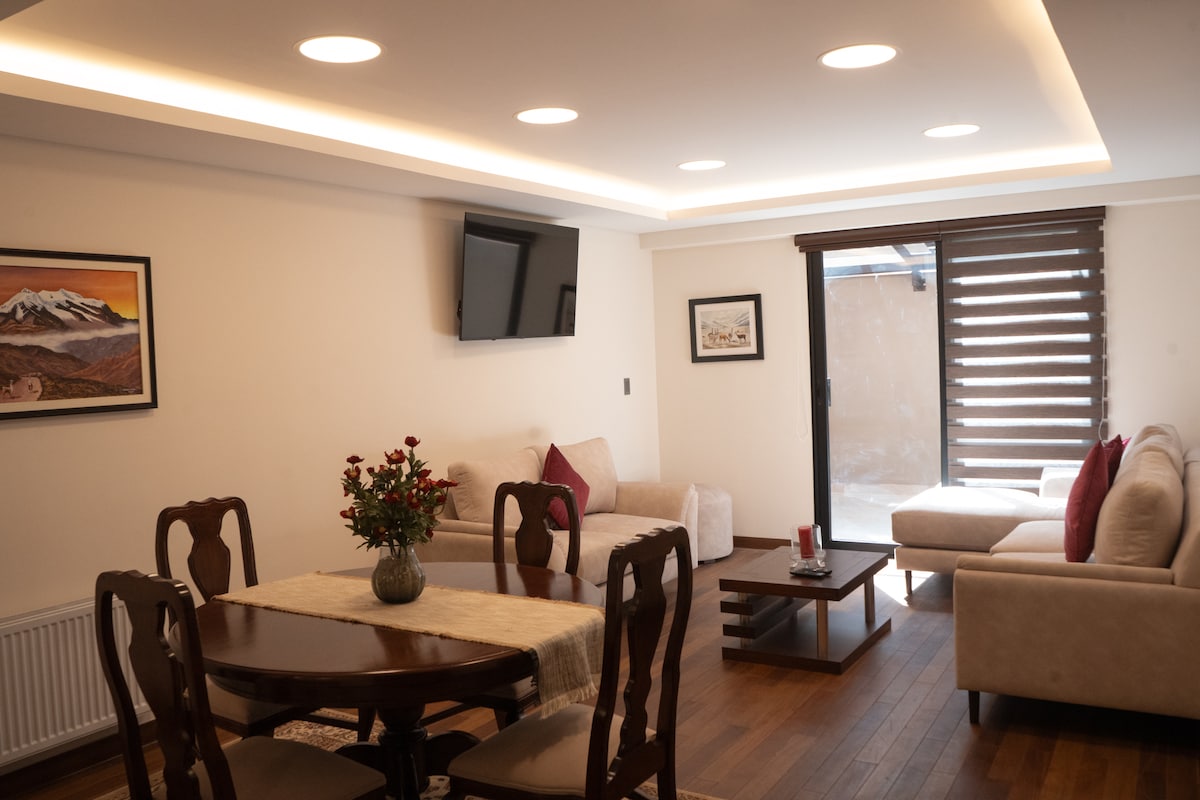 Con cambio de ropa blanca cada 15 días en reservas de más de 1 mes, sin costo. cuenta con Netflix. Departamento acogedor, amplio y seguro, en la zona centro de la ciudad de La Paz; por ello cuenta con todo tipo de servicios cerca. El Transporte Público (incluido el Teleférico), es constante y te lleva a todas parte de La Paz y El Alto. Se encuentra cerca de Facultad de Medicina y Post grado UMSA y Estadio H.Siles. encantador,ideal para parejas o profesionales. Espacioso, cálido y artístico .