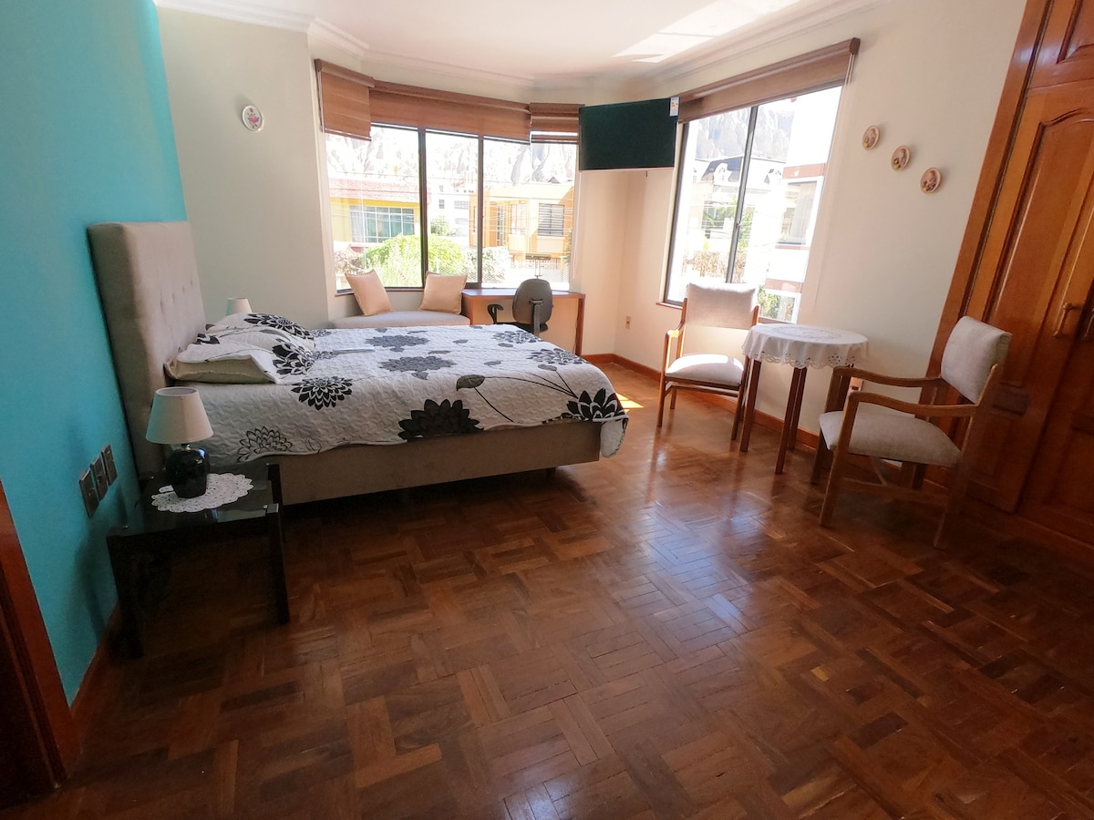 Cozy Loft with a panoramic view of the Mountains and Snow Peaks of La Paz. Located in Isla Verde-Golf Club, the greenest and most peaceful area of the city. The loft is situated on the second floor of our charming house, designed and surrounded by the art of the artist Giancarla Gaia. The studio has an independent entrance, private bathroom and shared kitchen, barbecue area surrounded by gardens and sculptures. Secure gated community with parking available. POSSIBLE PAYMENT IN BOLIVIANOS