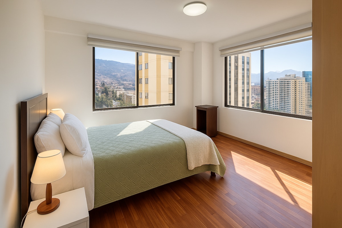 Enjoy a unique experience in our panoramic apartment 🏙️ in the heart of La Paz. Surrounded by restaurants, cafes, attractions, plazas, pubs, supermarkets, and much more. Located on the 18th floor, you won't miss any of La Paz's beauty. The apartment is equipped with everything you need to make you feel at home 🏠 . From the doorstep, you'll find transportation to all points of the city 🚌. The building has 24-hour security and surveillance for your safety.