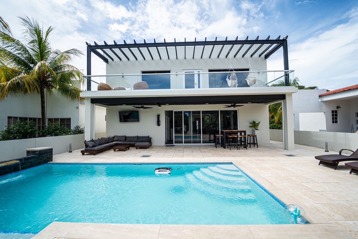 Beachfront Mediterranean style house with 3 bedrooms, 2 baths. Features a large pool and direct access to the beach. Spacious kitchen and open concept dining, living room and bar area with plenty of natural light. FREE WIFI, 2 Smart TVs, and Air Conditioning in bedrooms. Bedding configuration is for 10 people in 8 beds: 1 King, 1 Full and 6 Singles. One bedroom/bath in the first floor and 2 bedrooms/bath on the second floor. One of the bedrooms has a 4th bedroom inside of it with a folding door.