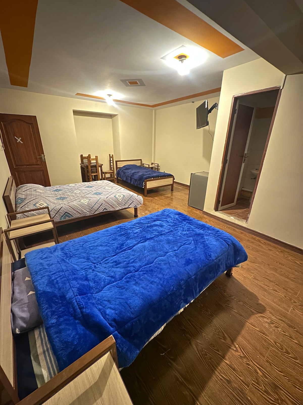 Disfruta de una estancia cómoda y acogedora en esta amplia habitación con ubicación privilegiada cerca a la avenida principal 6 de Agosto y el embarque para la Isla del Sol. 🛏️ Lo que ofrece la habitación: • Cama queen size • Decoración mural pintada a mano con inspiración costera mediterránea • Área de estar con mesa redonda para trabajo. • Baño privado y TV Cable • Calefacción para climas fríos • Hervidor eléctrico 📍 Ubicada en el Hotel Lago Azul. ¡Reserva ahora!