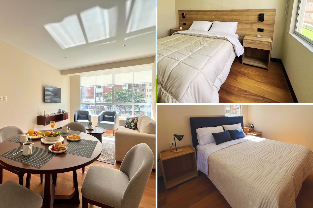 Disfruta La Paz desde Sopocachi, uno de los barrios más culturales y céntricos de la ciudad. Este luminoso departamento cuenta con balcón y terraza privada con vistas despejadas, un ambiente tranquilo para descansar, trabajar o simplemente sentirte en casa. El espacio fue diseñado para viajeros que valoran la comodidad, la privacidad y la buena ubicación: a solo pasos de cafés, restaurantes, mercados y la vida cultural paceña.