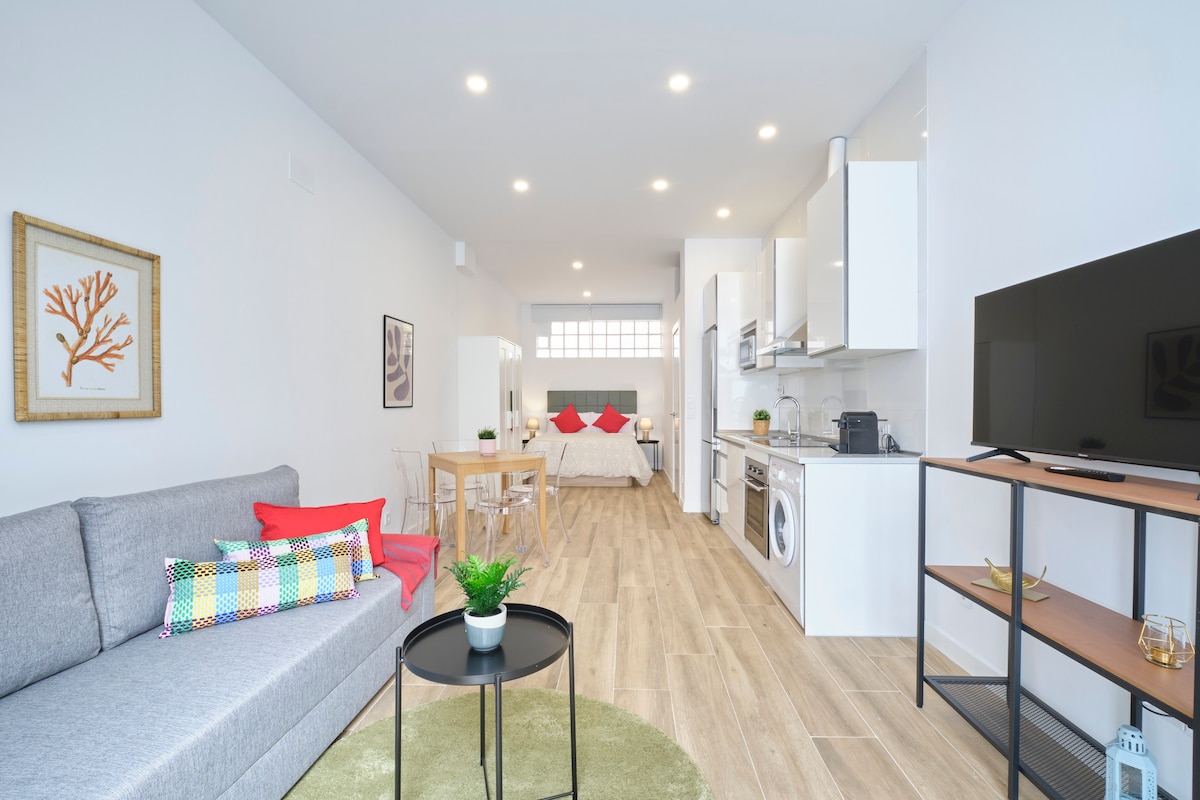 Cómodo y vanguardista estudio recién reformado. De diseño moderno en barrio tranquilo. Con todo lo necesario en los alrededores, supermercados, línea de autobús y metro cercana. * Cama grande de 150 x 190 * Bomba de frío y calor de alta calidad * Baño completo con placa de ducha * WIFI, Televisión * Recién reformado, aire moderno * Opción de parking disponible (es necesario solicitarla)