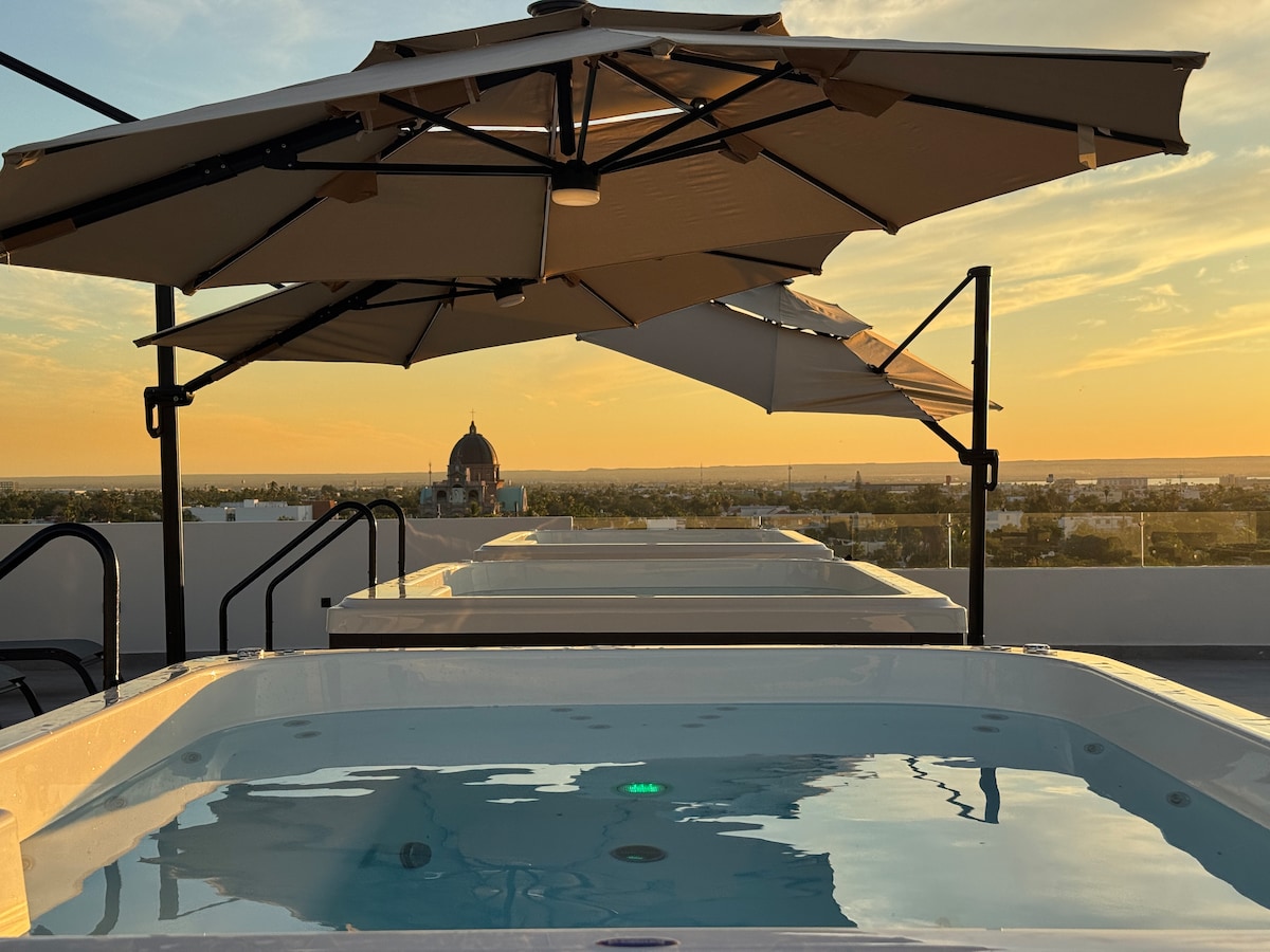 ✨ Rooftop con tina a 1 calle del mar Disfruta de atardeceres increíbles desde tu jacuzzi privado en la azotea. Este moderno condominio es perfecto para una escapada romántica o un descanso relajante. Ubicado en una zona tranquila, a solo una calle del mar y rodeado de palmeras y brisa marina. 🛏 1 habitación cómoda 🛁 2 baños completos 👙 Rooftop privado con tina ☕ Cocina equipada + aire acondicionado 🌐 Wi-Fi y estacionamiento incluido Relájate, desconéctate !
