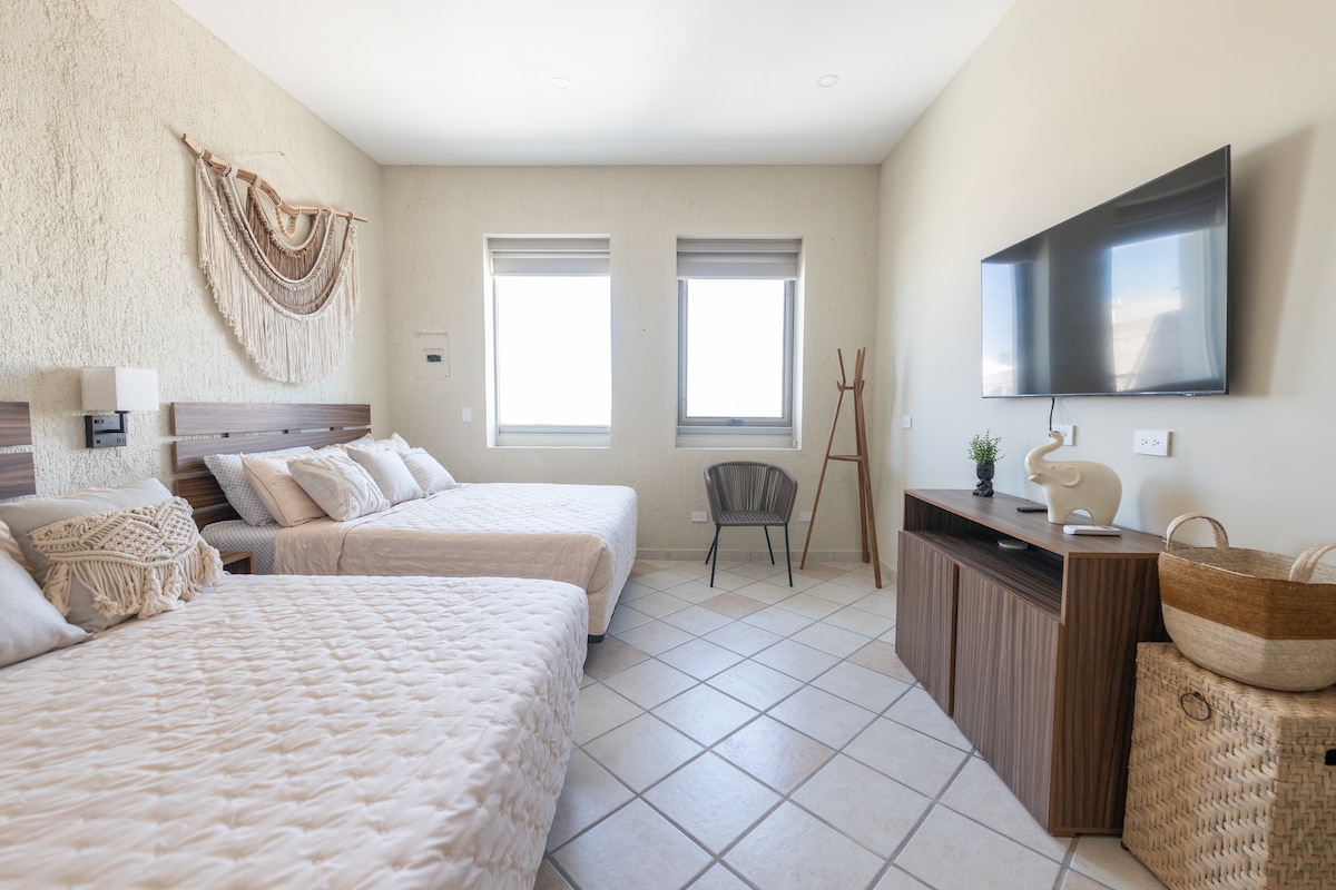 Welcome to our lovely loft, perfectly nestled in downtown La Paz, just three blocks from the beautiful malecon. This cozy space is ideal for friends, a family of four, couples or solo travelers offering two queen-size beds, a kitchenette, a full bathroom, and a dining table. You'll find it convenient for exploring La Paz any time of the year, with many attractions within walking distance.