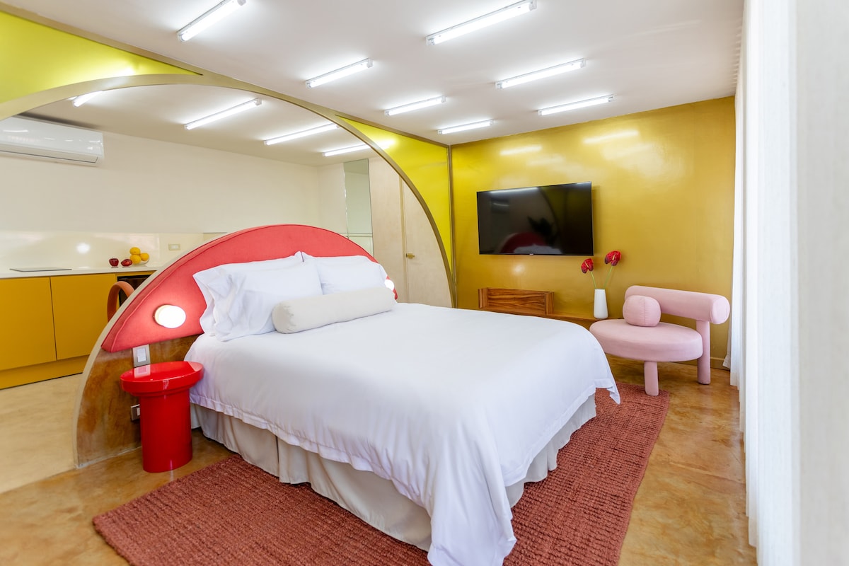 Es un espacio con mucha iluminación, con una decoración sencilla pero de buen gusto, en colores blancos y grises , con una cocina completamente equipada , Smart-tv , confort y en un área céntrica y muy cerca del malecón de la ciudad, hay restaurantes de varios tipos de cocinas internacionales cercanos y mercados municipales, farmacias. Bares sobre el paseo costero