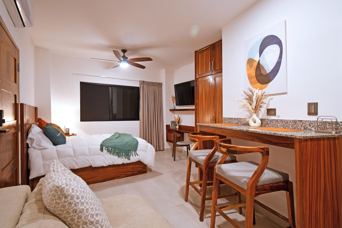 Beautiful downtown 270 sqft designer studio. 3 blocks to the Malecon beach, you can rent kayaks and paddle boards, chill on the sand, or take the Balandra beach bus. The best restaurants are within walking distance. Walk one or two blocks to supermarkets, mini-marts, museums, coffee shops, bars, bus central, and restaurants. High-speed Wi-Fi 6. Fully equipped kitchenette. 3 times filtered tap water. ⇨Monthly discount factored in at booking⇦ ⇨Book today!