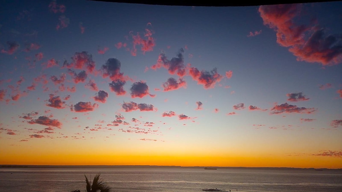 This modern one bedroom condo has among the best views in La Paz. It includes a private balcony, big communal pools with shaded areas, BBQ, lounge seats and comes with gorgeous views of the ocean and sunsets. The condo has all the necessary amenities - washer/dryer, fully equiped kitchen, smart TV, AC and WiFi. Grocery stores, cafes, La Paz's best restaurants & beaches all a few minutes drive away. Safe and quiet area. Gated secure parking. Perfect for your La Paz vacation.