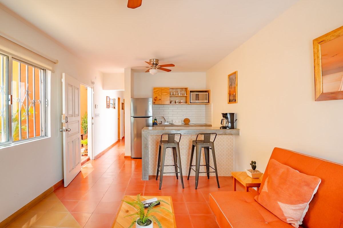 Comfortable 1 bedroom with a kingsize bed apartment, a cozy patio for two, and free parking on the street, right in front of the apartment. It is a one-floor apartment with optical fiber wifi. We have a small but functional kitchen and a big enough fridge. It is 12 blocks away from the Malecon, a 4-minute drive, or an 18-minute walk (1.5 km / 0.93 miles). The living room area has a couch to chill with a TV, there is also a smaller TV in the bedroom. There is no high water pressure in the shower.