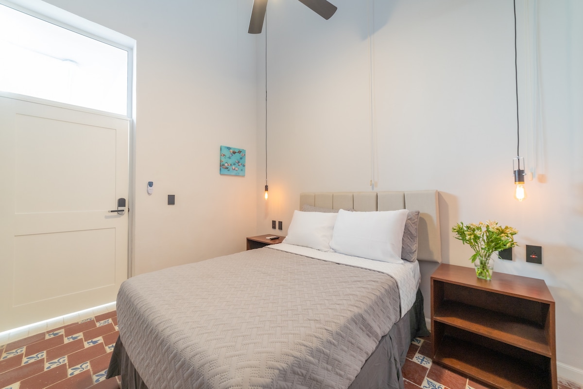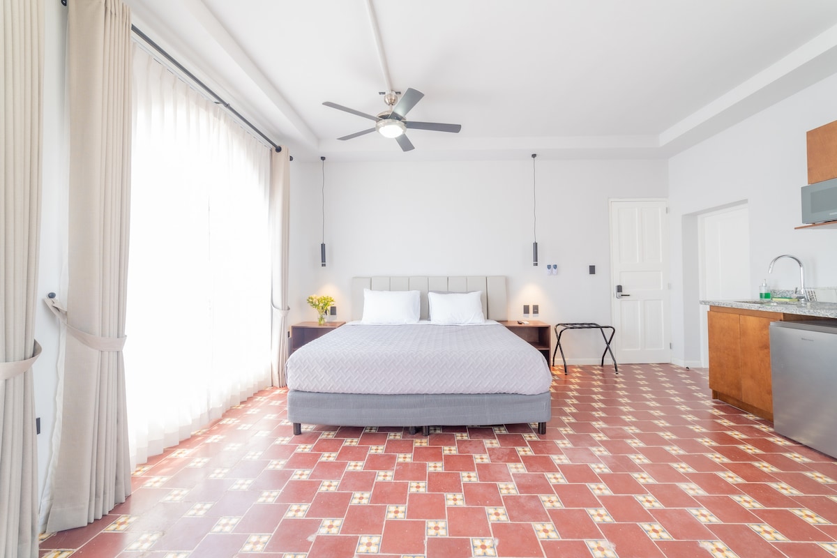 Cada Junior Suite está decorada individualmente por artesanos locales con una mezcla de estilo colonial español y mexicano. Podrá encontrar TV de 55 pulgadas con señal de cable y un gran escritorio de madera. El baño esta totalmente equipado. 1 Cama King size. Ocupación máxima: 2 personas. Desayuno Americano incluido. Aire acondicionado Secadora de cabello. Plancha y tabla de planchar. Caja fuerte. Café americano y expreso. Variedad de snacks como galletas, chips y cacahuates en cortesía.