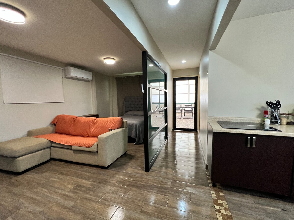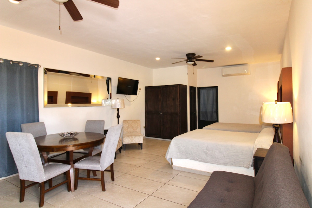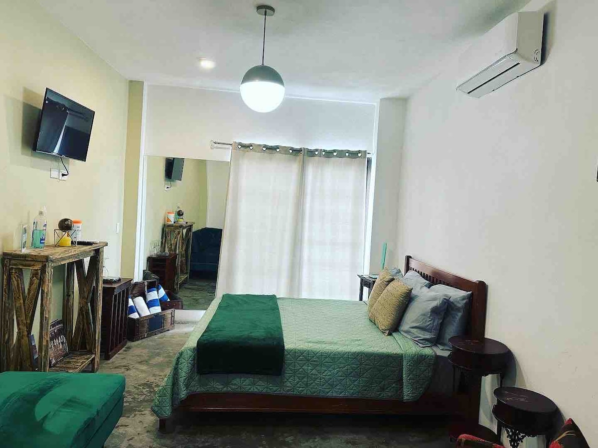 Disfruta de la comodidad y la excelente ubicación de estudio. A pocos pasos de la playa, restaurantes, súper mercados, cine paradas de autobús, etcétera. A pocos 5 minutos de la playa A 7 minutos del hermoso malecón. Cuenta con una cama queen size, baño equipado, wifi, refrigerador, microondas entre otras amenidades escenciales para tu estancia.