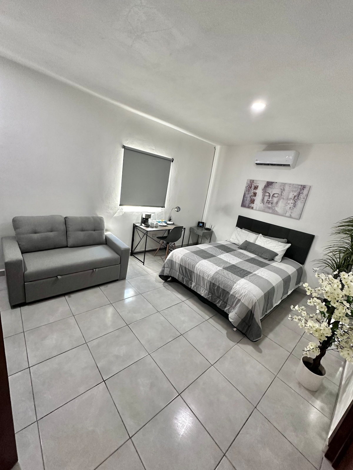 Enjoy the simplicity of this quiet and central accommodation. You will get comfort, good location and security at an affordable price, so that you can fully enjoy a 5-star stay in our beautiful city of La Paz. Close to shopping malls, museums, theaters, pharmacies, restaurants, gas stations, hospitals, etc. A/C, smart screen with streaming platforms, space to work, iron, boyler, kitchen items, coffee makers, microwave, induction grill and refrigerator.