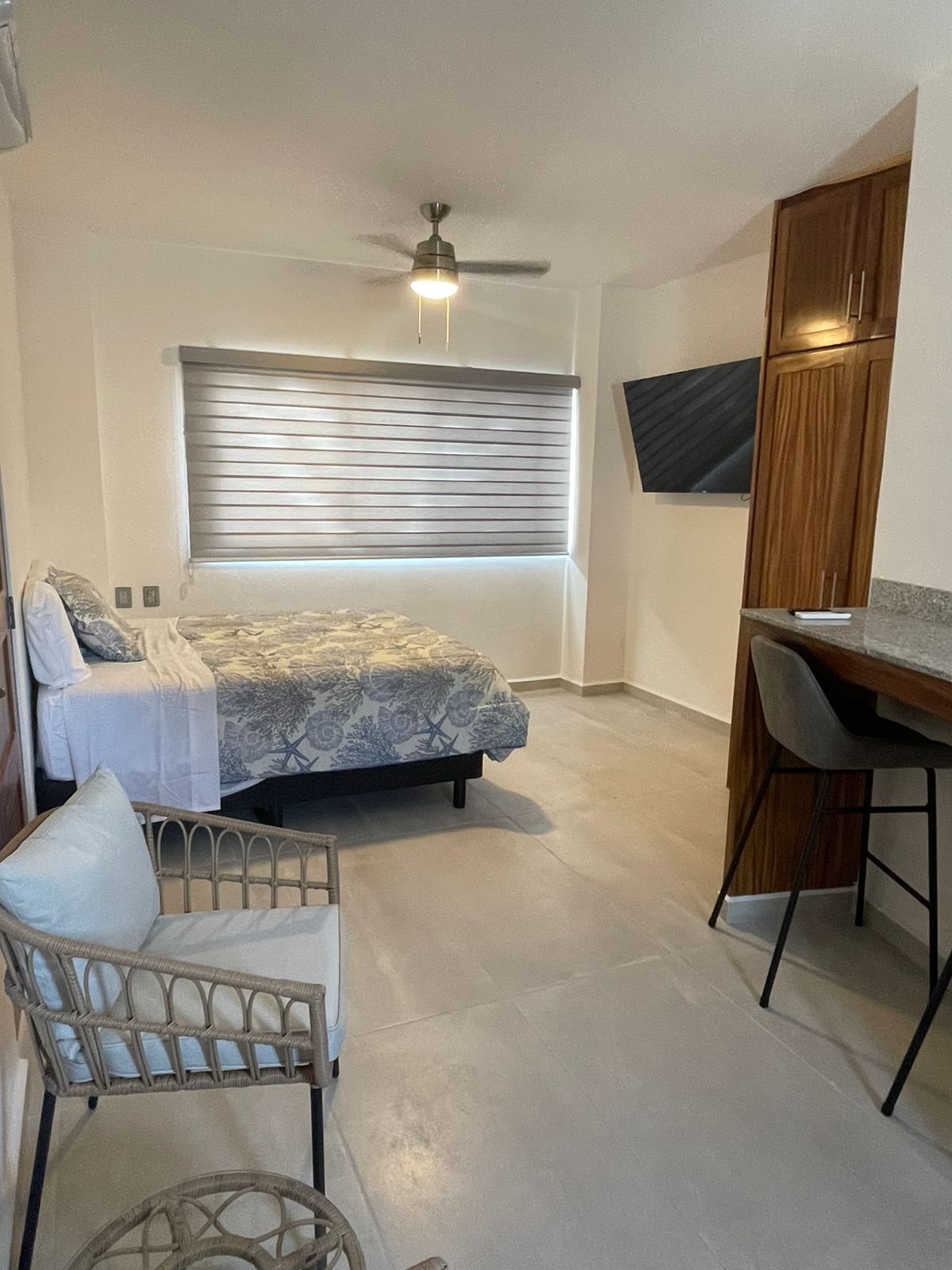 Suite Turquesa es un departamento ubicado en un complejo de 6 deptos. similares, llamado Brisa & Mar. Es un espacio amplio, tipo estudio, con una cama Queen, cocina completa, sala de tele (SmartTV), baño completo, wifi, aire acondicionado, comedor, y estacionamiento privado. Está ubicado a 8 min del malecón en carro, y a 10 min del aeropuerto, en una zona tranquila. A 600 m hay una playa perfecta para salir a caminar. El uso de la alberca es compartido.