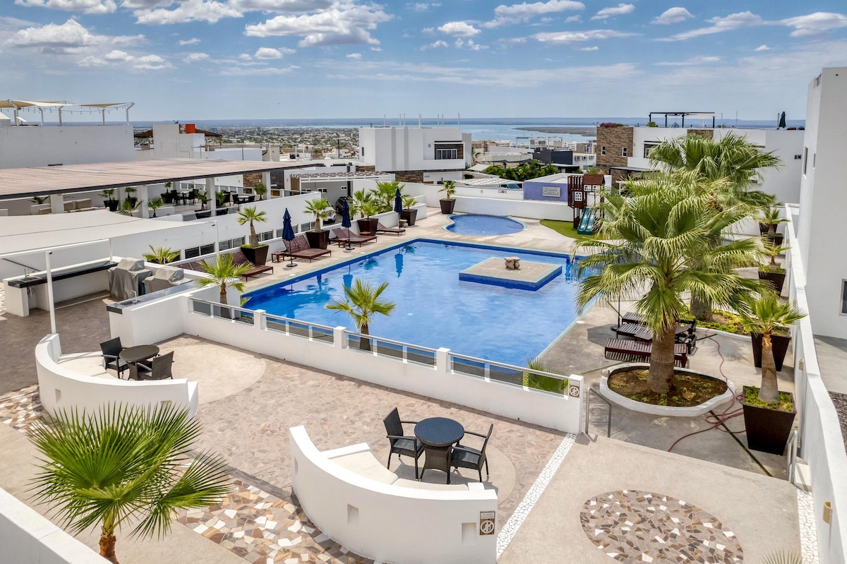 Welcome to Exclusive Marina/Beach Front Condo La Paz ! Modern apartment of 90 square meters, facing Marina de Cortez with breathtaking views of the marina and Malecón, just an 8-minute walk from downtown. Fully equipped kitchen, high-speed Wi-Fi (62 Mbps), silent air conditioning. Saltwater pool (8am-9pm), Jacuzzi, 3 BBQ areas (advance booking required), gym, yoga room, massage area (booking required, extra charge), and 24/7 security. Ideal for couples, families, or remote workers.