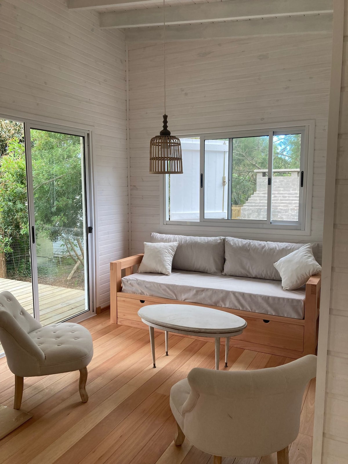 Ubicada frente al mar. Una vista privilegiada que permite ver al mar en su totalidad y un bosque hermoso al mismo tiempo. Una de las cuatro casitas que se encuentran en el predio. Nos gusta llamarlas "Las TATETI". Una casita de tamaño perfecto para viajar de a dos y disfrutar de la tranquilidad de Santa Isabel. Cuentan con cocina-comedor completa, baño privado y una cama súper cómoda. Desde el deck de madera pueden observar el mar.
