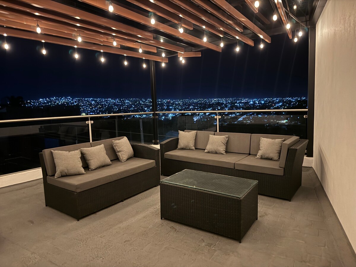 -Un Penthouse con una vista y ubicación privilegiada. -Muy cerca del centro Histórico de Guadalajara y de fácil acceso, estacionamiento priv. -Cuenta con Terraza y Jacuzzi privado al aire libre. Podrás tener un tranquilo y gratificante alojamiento con nosotros, ubicado en el nivel 9 a un costado del elevador en una torre de apartamentos exclusivos, con cómodas instalaciones y acogedores ambientes diseñados para que vivas una experiencia increíble! Será un gusto poder recibirte con nosotros.