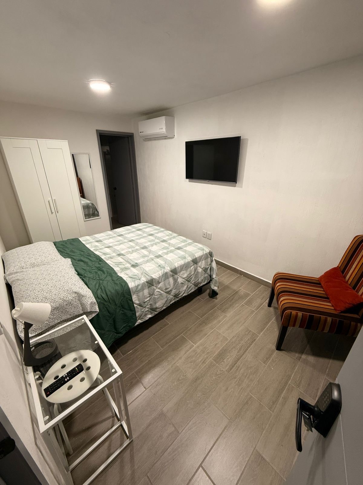 Este espacio, es excelente para estancias largas o cortas, cuenta con todo lo necesario para tu comodidad, cocina equipada, bien iluminado, son dos recamaras, en una se encuentra la cocina, estudio y televisión, tiene un balcón lleno de plantas, con una hamaca super cómoda para la siesta, un pequeño comedor. En esta recamara contamos con un futon que se hace cama matrimonial. La segunda recamara tiene unos sillones y la cama principal que es también matrimonial.