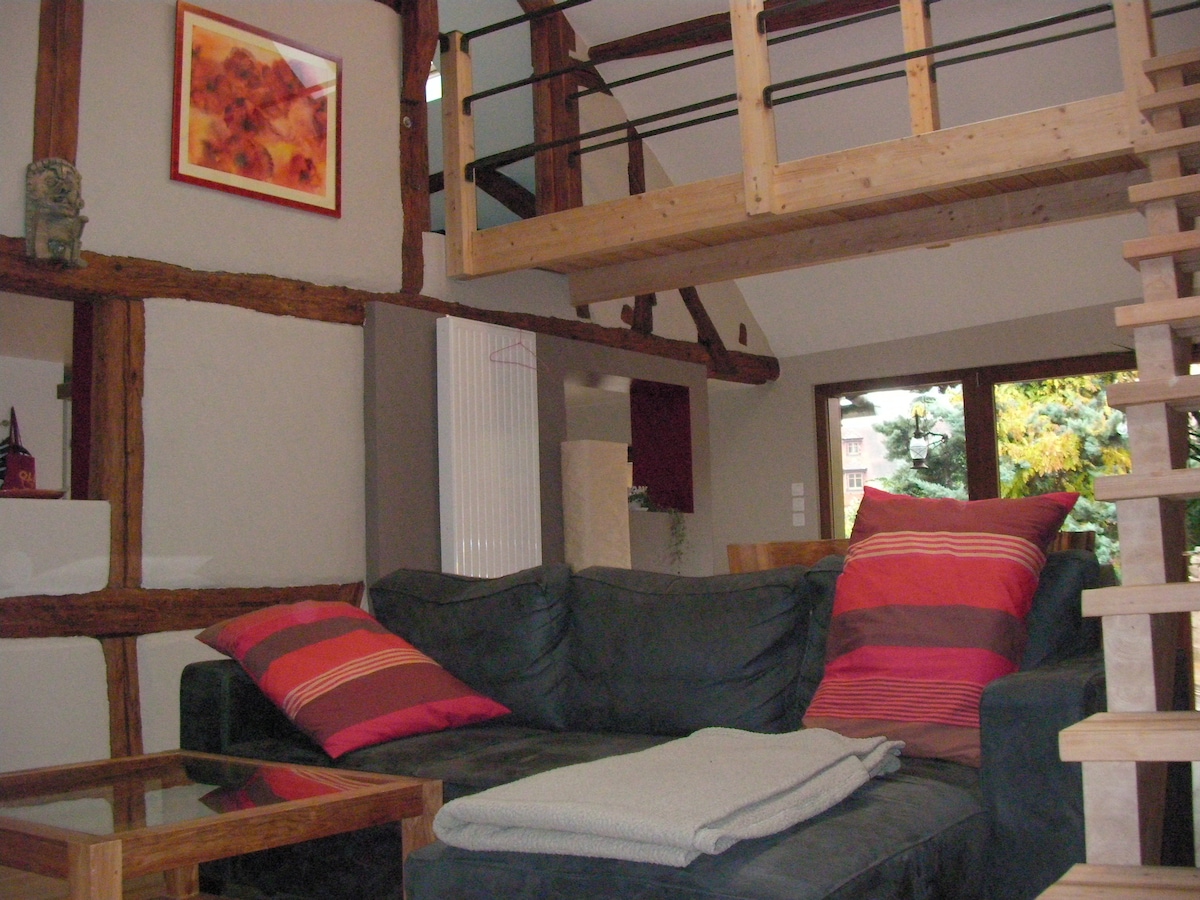 Notre gite est un petit appartement de 48 M2 pour 2/3 personnes , au premier étage d'un corps de ferme alsacien. Entièrement réaménagé , il présente tout le confort pour passer un agréable séjour dans notre région.Il est situé dans un cadre verdoyant ,chaleureux et au calme au milieu d'une propriété de 30 ares . Une terrasse dans le jardin, sous un cerisier et au bord d'un bassin de carpes Koï vous est réservez. Nous sommes situés à 15 minutes du vignoble alsacien et à 40 minutes de Europapark