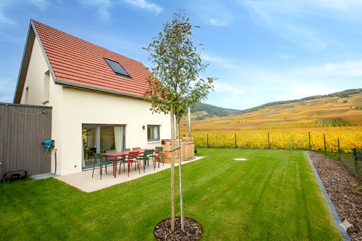 Partez à la découverte des trésors de l'Alsace depuis cet ancien corps de ferme entièrement rénové. Dédié à la détente et au soin du corps, vous profiterez d'un bel espace lumineux, de prestations haut de gamme et de matériaux de qualité. Réservation possible pour le télétravail (wifi fibre) Pour les fanatiques de course à pied n’hésitez pas à mettre vos baskets : un magnifique parcours vous attend. A 200m, les samedis matins sur la place du village un petit marché vous permettra de faire le plein de légumes. Sur votre passage n’oubliez pas votre baguette et quelques douceurs. A votre arrivée deux places de parking vous sont réservées. Attrapez les clefs et entrez sans hésitation dans ce duplex inversé pour vivre des moments uniques de bien être dans un cadre soigné. La maison mitoyenne est entièrement équipée sur trois niveaux, le gite se compose au rez-de-chaussée d'une entrée, d'un WC et de deux chambres à coucher avec chacune sa salle d'eau attenante et privative. Au 1er étage, un salon, une cuisine équipée ouverte sur le coin repas et donnant sur une terrasse ainsi qu'à l’espace Wellness. Au 2ème étage, une chambres à coucher avec une salle d'eau attenante et un WC séparé. Venez vous ressourcer dans ce magnifique gîte qui bat aux rythmes des saisons. Pour vous détendre, profitez de l’espace Wellness équipé d’un Sanarium KLAFS et de fauteuils relaxants. Peut-être vous laisserez-vous tenter par le coin tisanerie ? C’est l’heure du repas ! Tous les ustensiles de cuisines vous attendent pour préparer des bons petits plats dans une cuisine conviviale toute équipée et ouverte sur la salle à manger. Pour compléter vos mets, profitez avec modération de la cave à vin. Les bouteilles proposées sont en sus de votre séjour. David vous proposera de découvrir plusieurs cépages d’Alsace et d’ailleurs. Après un bon repas, détendez-vous dans le salon, plusieurs jeux de société sont à portée de main. Que le meilleur gagne ! Pour les cinéphiles un téléviseur est à votre disposition. Votre journée est terminée. Très contemporaines nos chambres spacieuses respirent le confort, équipé chacune de salle de bain avec baignoire ou douche, lit King-size double ou simple, sèche-cheveux, serviettes, peignoirs et bureau. Disponibilité Idéalement situé au cœur de la plaine d'Alsace, le logement se trouve à une dizaine de minutes seulement de Colmar, vous offrant les commodités d'une grande ville et le charme typique d'une cité alsacienne. Une boulangerie se trouve à 300 mètres. Taxi Bus Classement de Tourisme 4 *