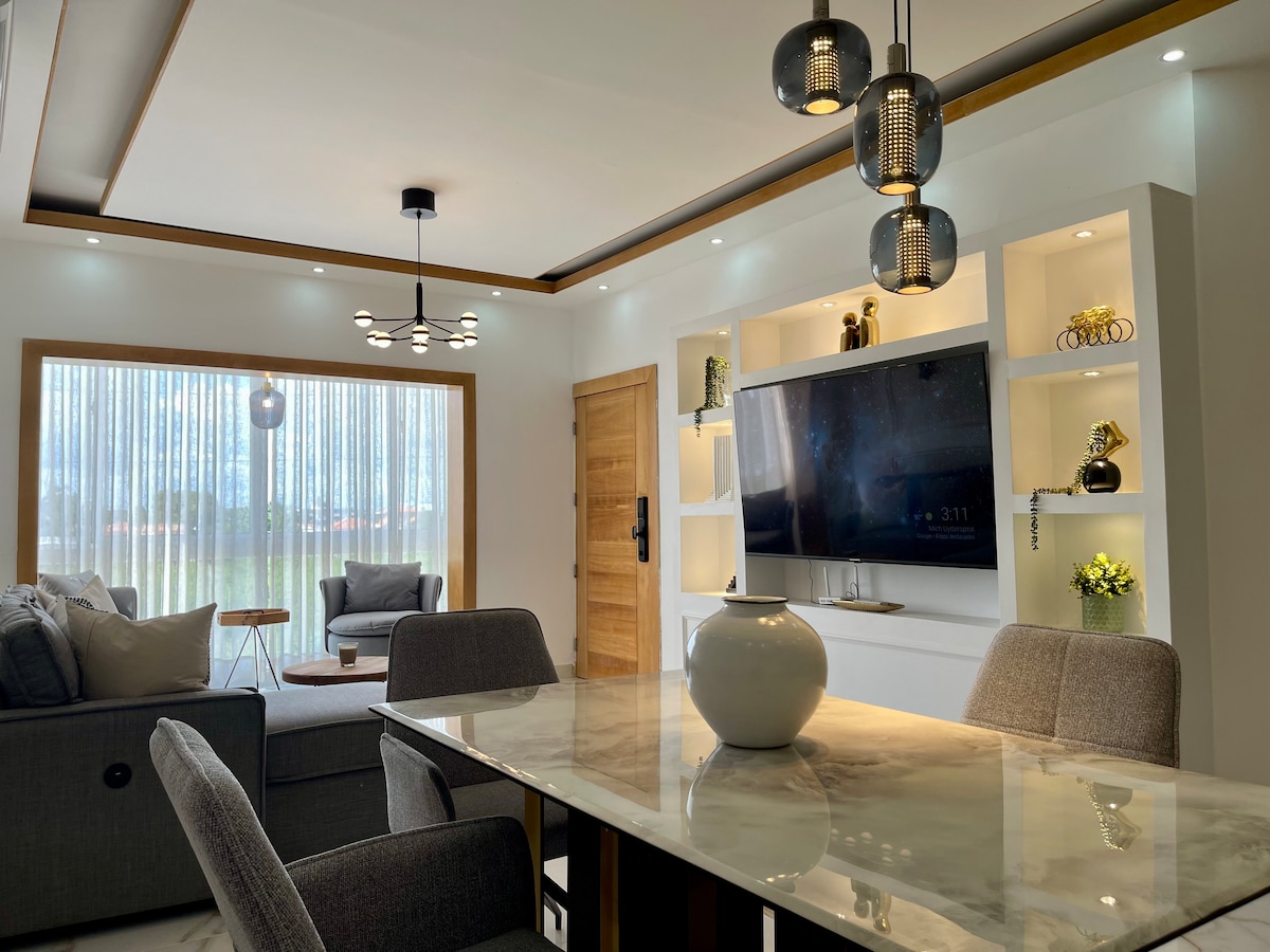 Casa adosada con entrada independiente en residencial tranquilo y seguro. Ubicada a 8 minutos del Aeropuerto Internacional Las Américas, 10 minutos de la Playa de Boca Chica y 20 minutos de Santo Domingo. 3 habitaciones todas con AC y 2 baños. Tiene Agua caliente, WiFi, Amazon Prime TV. 3 Smart TV, 1 en la sala y 2 en las habitaciones. Estacionamiento para 2 vehículos. Patio pequeño y cuarto de lavado.