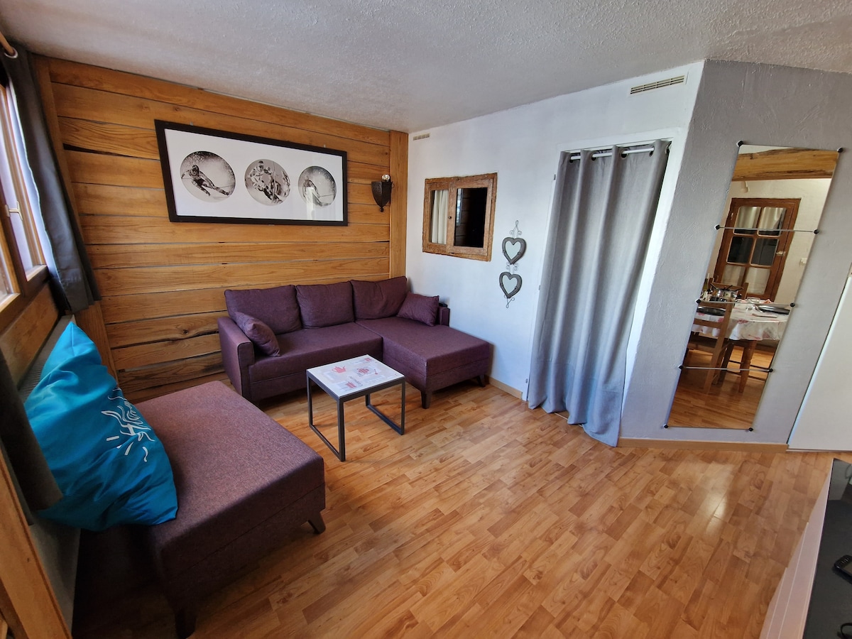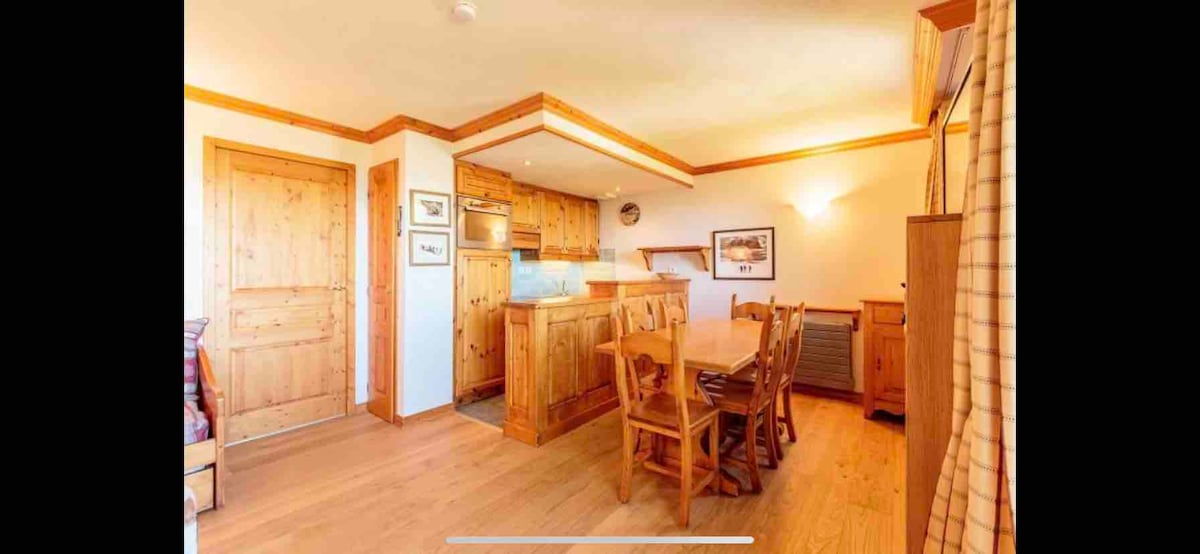 Appartement savoyard cosy au 1er étage. Au calme, voie sans issue, et résidentiel près du centre de la station. Vue dégagée sur la vallée de Courchevel. Orienté plein sud, la terrasse avec salon de jardin profite du soleil toute l'année. 2 chambres, une grande pièce ouverte sur cuisine, toute équipée, salle à manger et salon avec canapé lit. A 2mn à pied de la boulangerie, 5 du centre de la station et à 6 ou 7 du télécabine. WC séparé, salle d'eau avec douche à l'italienne.