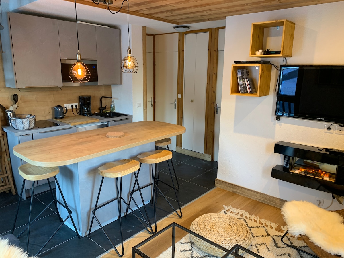 Un chalet chaleureux sur les coteaux de la colline de Brame-Farine, une large terrasse surplombant la ville thermale d'Allevard. Chalet entier avec grande terrasse, jardin, en bas des stations de ski du Collet d’Allevard et des 7 Laux ! - intérieur 40 m² - extérieur 100 m² - 1 chambre avec penderie, - 1 salle de bain avec douche et 1 toilette, - local de stockage attenant, notamment pour skis ou valises. " Bienvenue dans mon petit cocon, que j’ai mis du cœur à rénover pour vous ! "